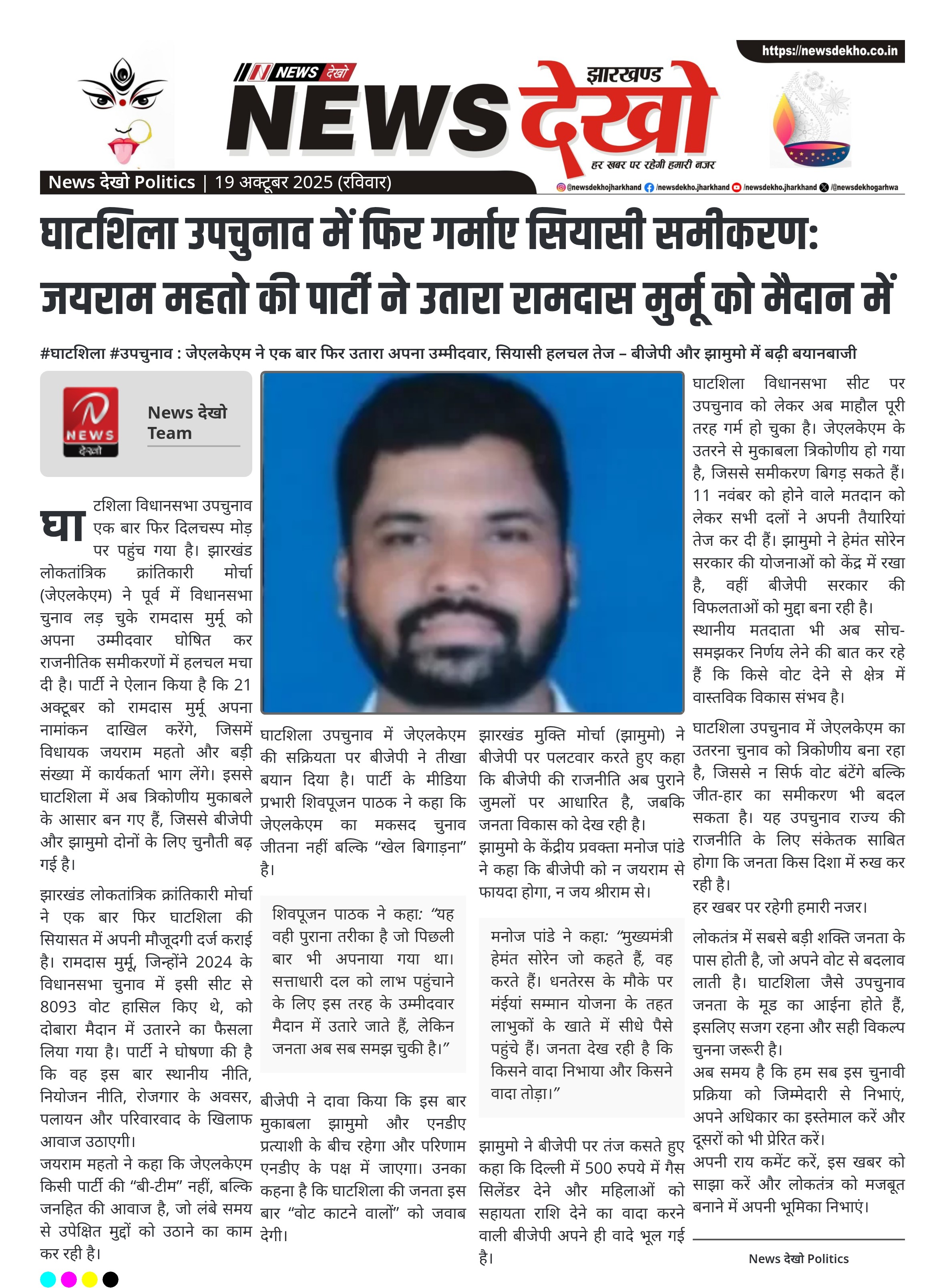#घाटशिला #उपचुनाव : जेएलकेएम ने एक बार फिर उतारा अपना उम्मीदवार, सियासी हलचल तेज – बीजेपी और झामुमो में बढ़ी बयानबाजी झारखंड लोकतांत्रिक क्रांतिकारी मोर्चा (जेएलकेएम) ने रामदास मुर्मू को घाटशिला उपचुनाव के लिए उम्मीदवार बनाया। 21 अक्टूबर को उम्मीदवार करेंगे नामांकन, विधायक जयराम महतो रहेंगे मौजूद। पिछली बार भी…