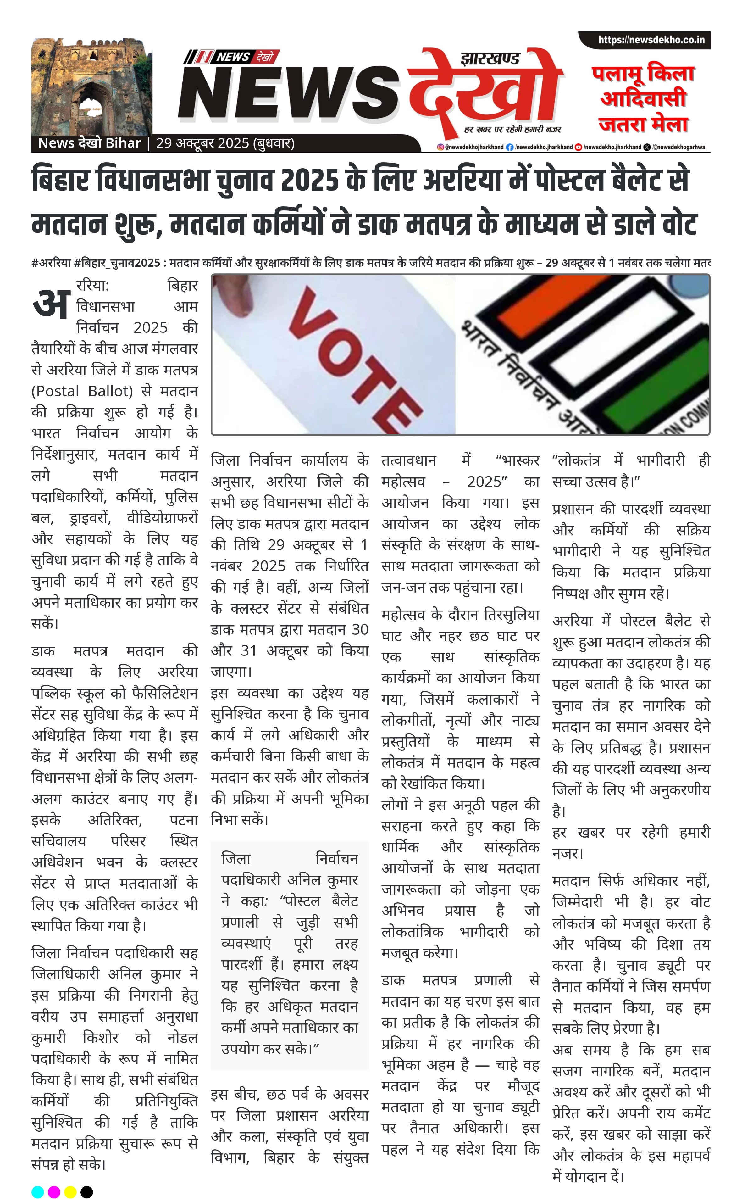 #अररिया #बिहार_चुनाव2025 : मतदान कर्मियों और सुरक्षाकर्मियों के लिए डाक मतपत्र के जरिये मतदान की प्रक्रिया शुरू – 29 अक्टूबर से 1 नवंबर तक चलेगा मतदान। बिहार विधानसभा आम निर्वाचन 2025 के लिए अररिया जिले में पोस्टल बैलेट से मतदान की प्रक्रिया शुरू। मतदान कार्य में लगे कर्मी, पुलिस बल,…