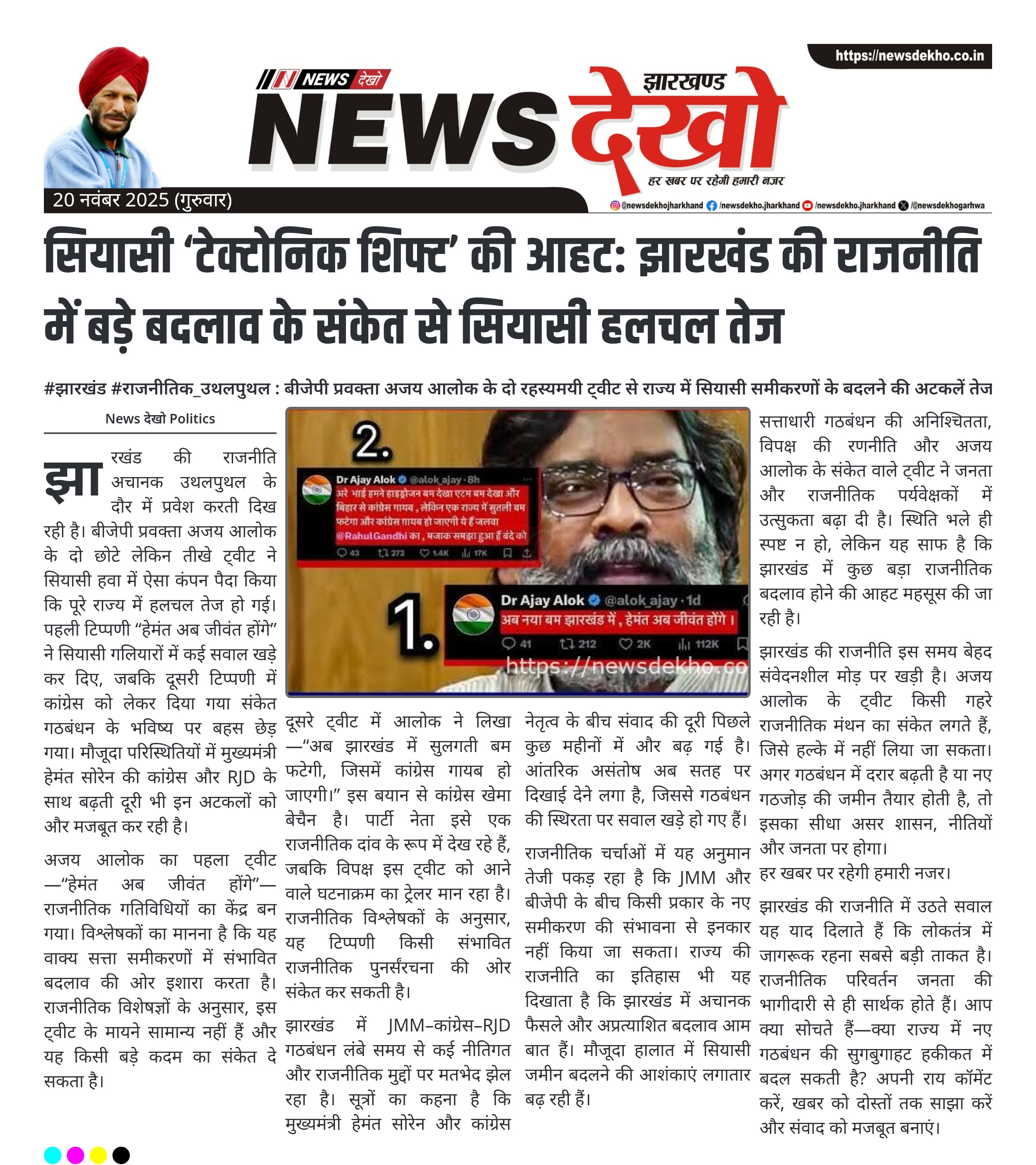 #झारखंड #राजनीतिक_उथलपुथल : बीजेपी प्रवक्ता अजय आलोक के दो रहस्यमयी ट्वीट से राज्य में सियासी समीकरणों के बदलने की अटकलें तेज हो गई हैं। बीजेपी प्रवक्ता अजय आलोक के दो ट्वीट ने राजनीतिक माहौल गर्म किया। “हेमंत अब जीवंत होंगे” ट्वीट पूरे दिन चर्चा का केंद्र। दूसरे ट्वीट में लिखा—“सुलगती…