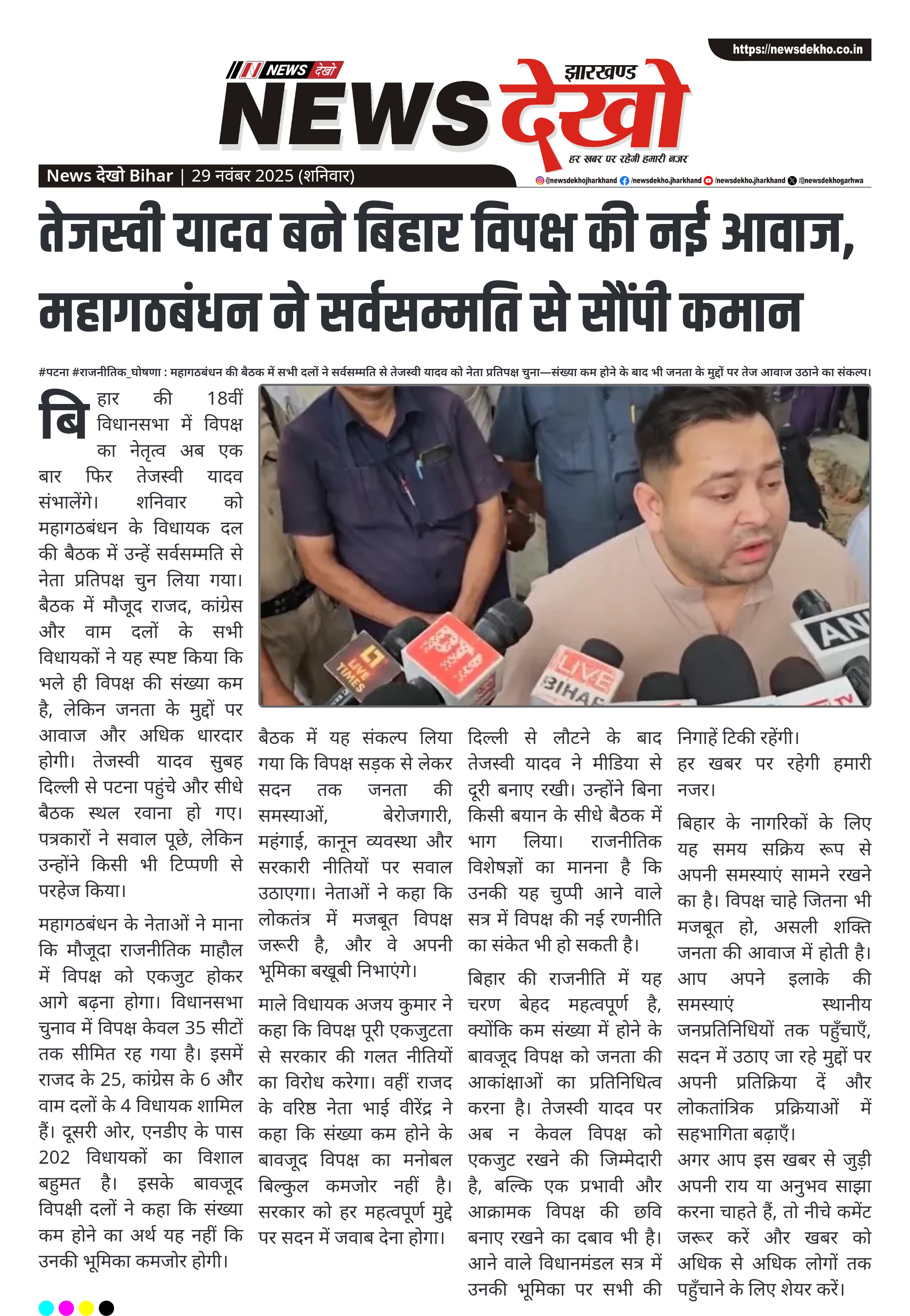 #पटना #राजनीतिक_घोषणा : महागठबंधन की बैठक में सभी दलों ने सर्वसम्मति से तेजस्वी यादव को नेता प्रतिपक्ष चुना—संख्या कम होने के बाद भी जनता के मुद्दों पर तेज आवाज उठाने का संकल्प। महागठबंधन के सभी 35 विधायक तेजस्वी यादव के चयन पर सहमत। बैठक एक पोलो रोड स्थित आवास पर…