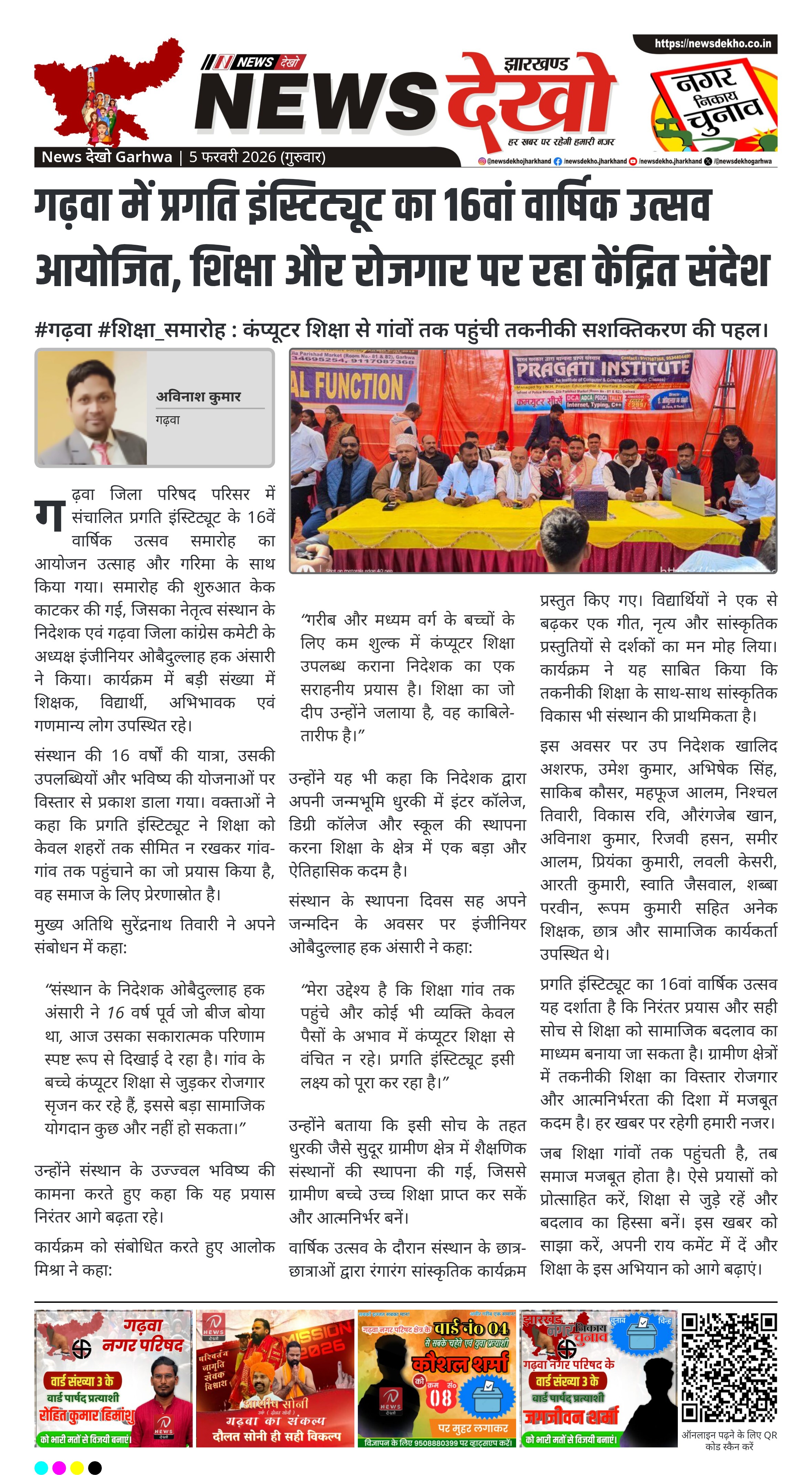 गढ़वा जिला परिषद परिसर में संचालित प्रगति इंस्टिट्यूट का 16वां वार्षिक उत्सव समारोह भव्य रूप से आयोजित किया गया। कार्यक्रम का उद्घाटन संस्थान के निदेशक इंजीनियर ओबैदुल्लाह हक अंसारी द्वारा केक काटकर किया गया। इस अवसर पर शिक्षा के माध्यम से ग्रामीण युवाओं को रोजगार से जोड़ने की उपलब्धियों पर चर्चा हुई। समारोह में शिक्षा, सामाजिक सेवा और तकनीकी सशक्तिकरण के महत्व को रेखांकित किया गया।