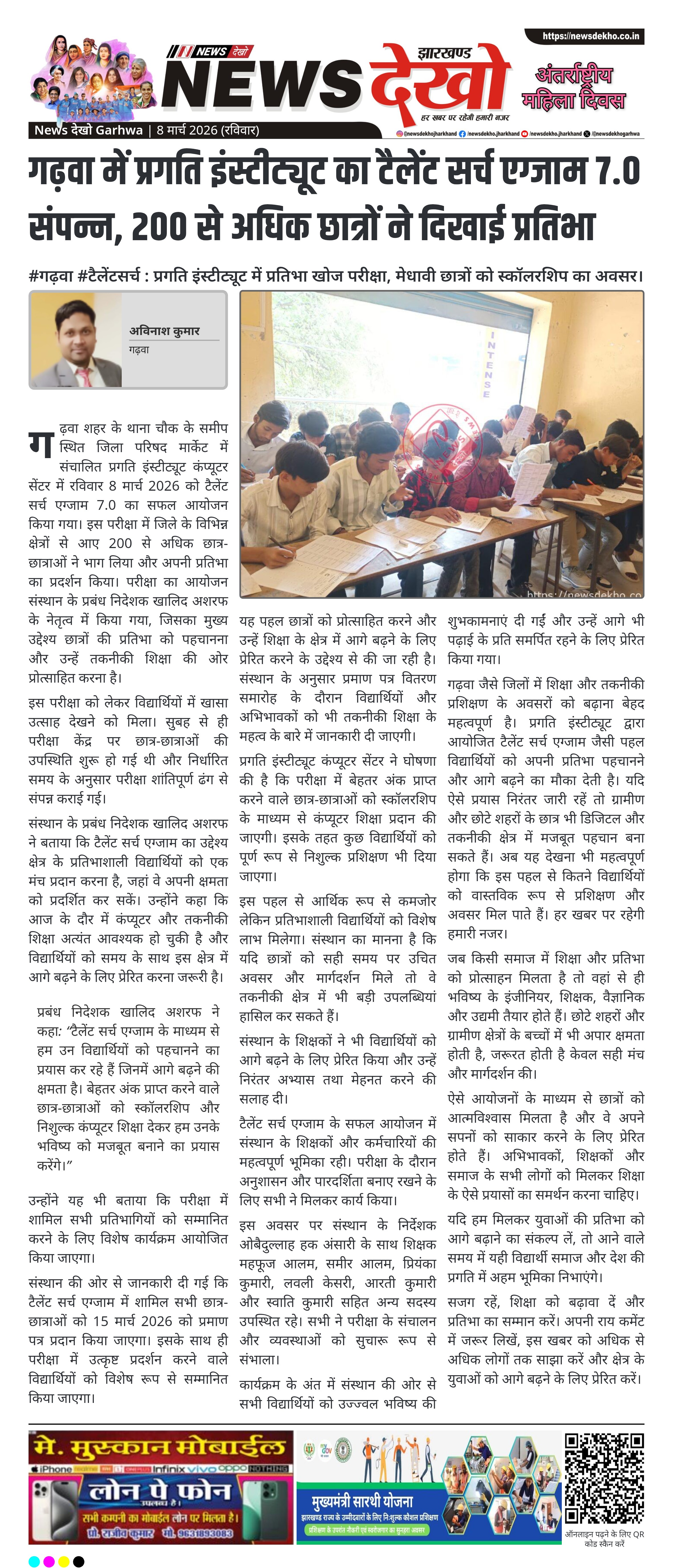 गढ़वा थाना के सामने जिला परिषद मार्केट स्थित प्रगति इंस्टीट्यूट कंप्यूटर सेंटर में 8 मार्च 2026 को टैलेंट सर्च एग्जाम 7.0 आयोजित किया गया। परीक्षा में 200 से अधिक छात्र-छात्राओं ने भाग लेकर अपनी प्रतिभा का प्रदर्शन किया। संस्थान के प्रबंध निदेशक खालिद अशरफ के नेतृत्व में आयोजित इस परीक्षा का उद्देश्य प्रतिभाशाली विद्यार्थियों को तकनीकी शिक्षा से जोड़ना है। परीक्षा में सफल छात्रों को प्रमाण पत्र और स्कॉलरशिप के माध्यम से कंप्यूटर शिक्षा प्रदान की जाएगी।