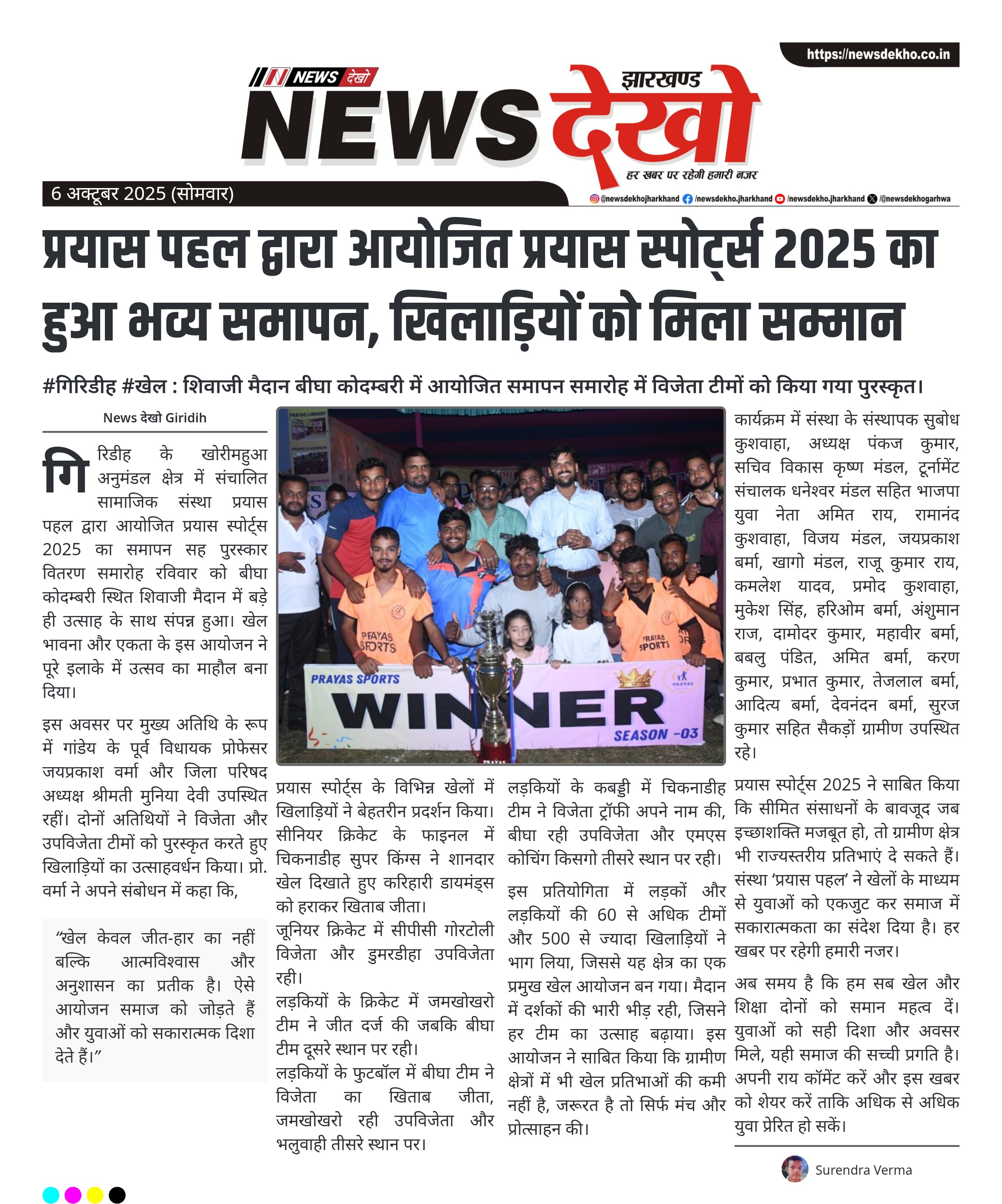 - चिकनाडीह सुपर किंग्स बनी सीनियर क्रिकेट की विजेता टीम, करिहारी डायमंड्स रही उपविजेता।