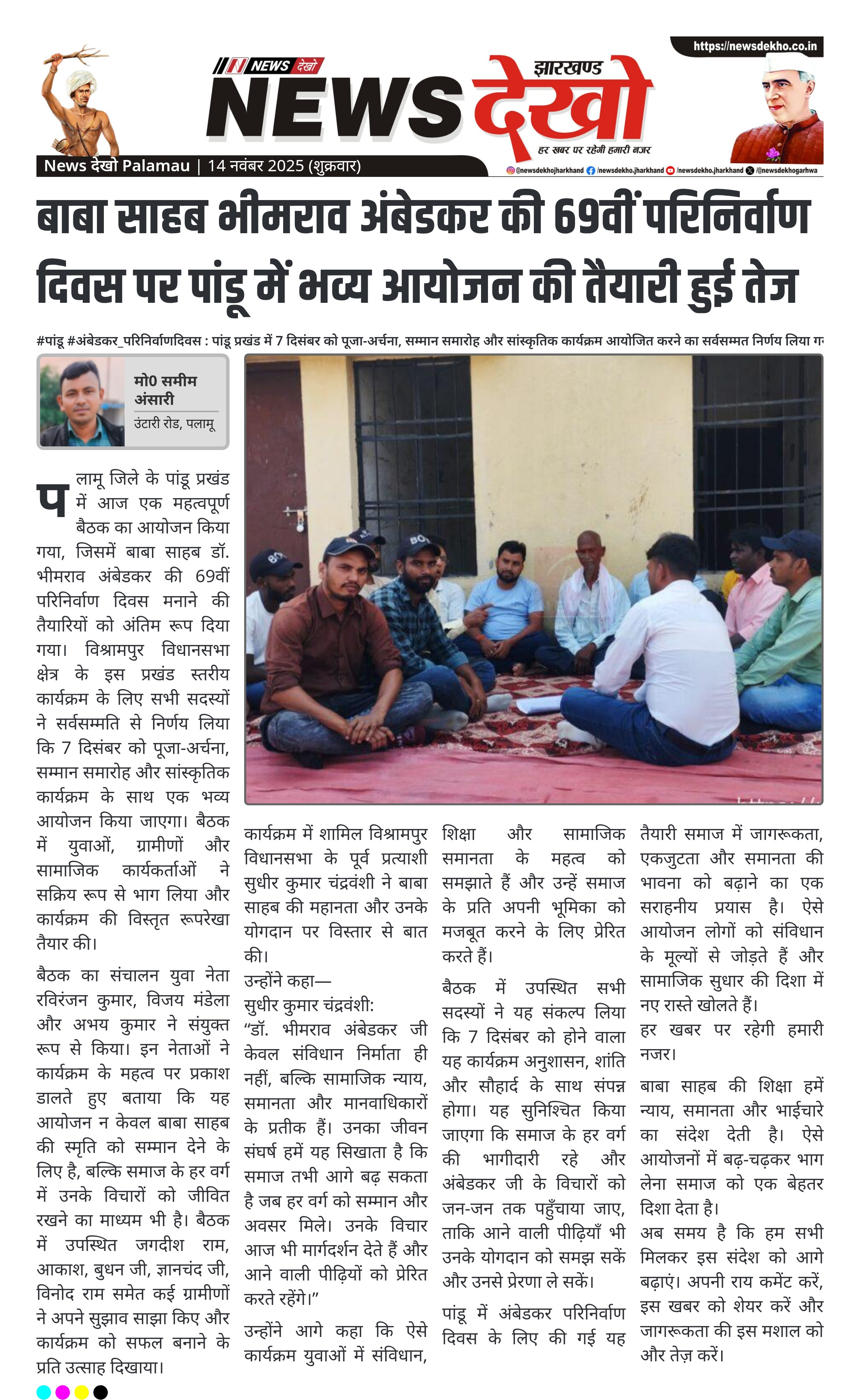 पलामू जिले के पांडू प्रखंड में आज एक महत्वपूर्ण बैठक का आयोजन किया गया, जिसमें बाबा साहब डॉ. भीमराव अंबेडकर की 69वीं परिनिर्वाण दिवस मनाने की तैयारियों को अंतिम रूप दिया गया। विश्रामपुर विधानसभा क्षेत्र के इस प्रखंड स्तरीय कार्यक्रम के लिए सभी सदस्यों ने सर्वसम्मति से निर्णय लिया कि 7 दिसंबर को पूजा-अर्चना, सम्मान समारोह और सांस्कृतिक कार्यक्रम के साथ एक भव्य आयोजन किया जाएगा। बैठक में युवाओं, ग्रामीणों और सामाजिक कार्यकर्ताओं ने सक्रिय रूप से भाग लिया और कार्यक्रम की विस्तृत रूपरेखा तैयार की।