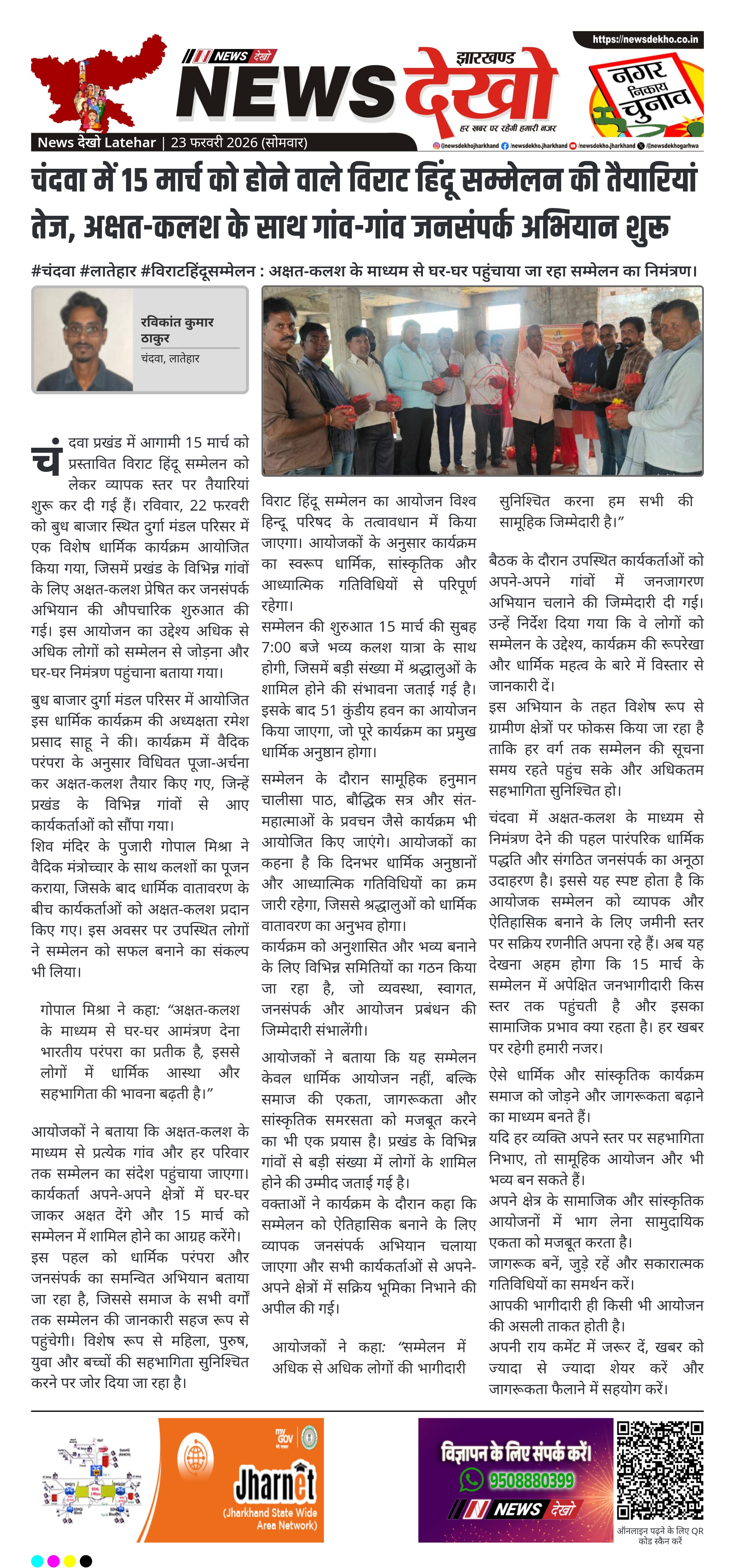 - 15 मार्च को चंदवा में आयोजित होगा विराट हिंदू सम्मेलन।