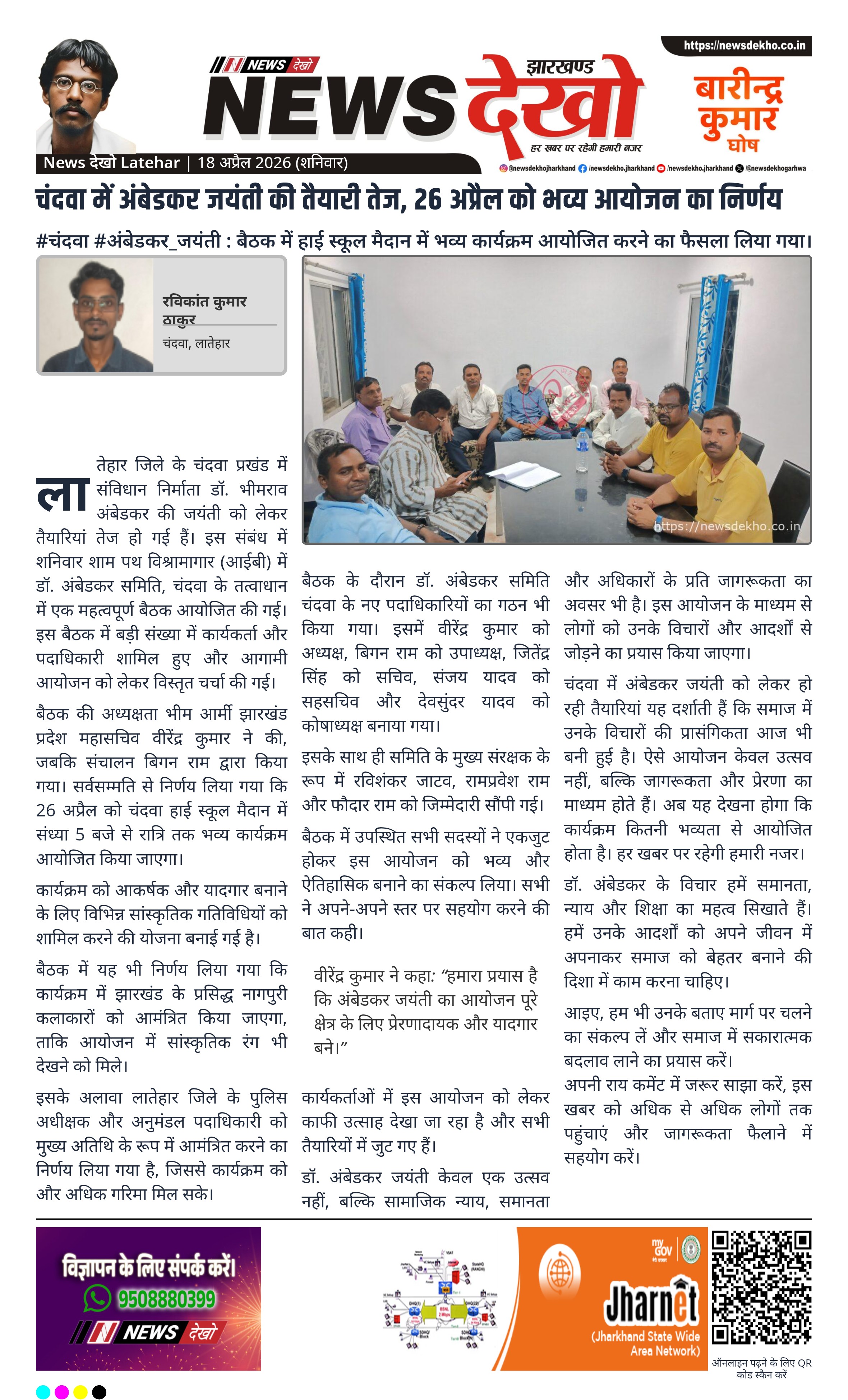 लातेहार के चंदवा में डॉ. भीमराव अंबेडकर जयंती के भव्य आयोजन की तैयारी शुरू हो गई है। इसको लेकर आयोजित बैठक में 26 अप्रैल को कार्यक्रम करने का निर्णय लिया गया। समिति के नए पदाधिकारियों का गठन भी किया गया। आयोजन को ऐतिहासिक बनाने का संकल्प लिया गया है।