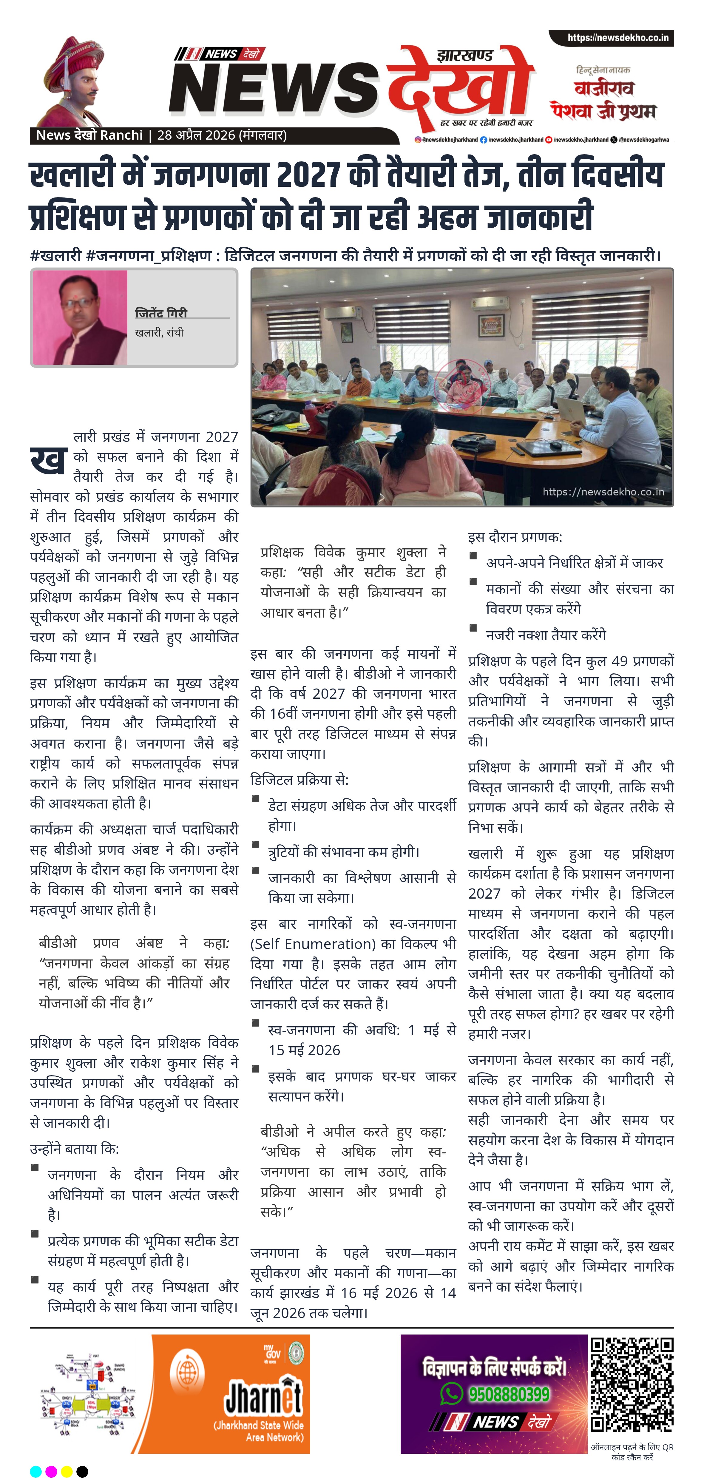 रांची जिले के खलारी प्रखंड में भारत जनगणना 2027 को लेकर तीन दिवसीय प्रशिक्षण कार्यक्रम शुरू हुआ है। इसमें प्रगणकों और पर्यवेक्षकों को मकान सूचीकरण एवं डेटा संग्रहण की प्रक्रिया सिखाई जा रही है। यह प्रशिक्षण आगामी डिजिटल जनगणना को सफल बनाने के उद्देश्य से आयोजित किया गया है। कार्यक्रम में अधिकारियों ने जनगणना को विकास योजनाओं की आधारशिला बताया।