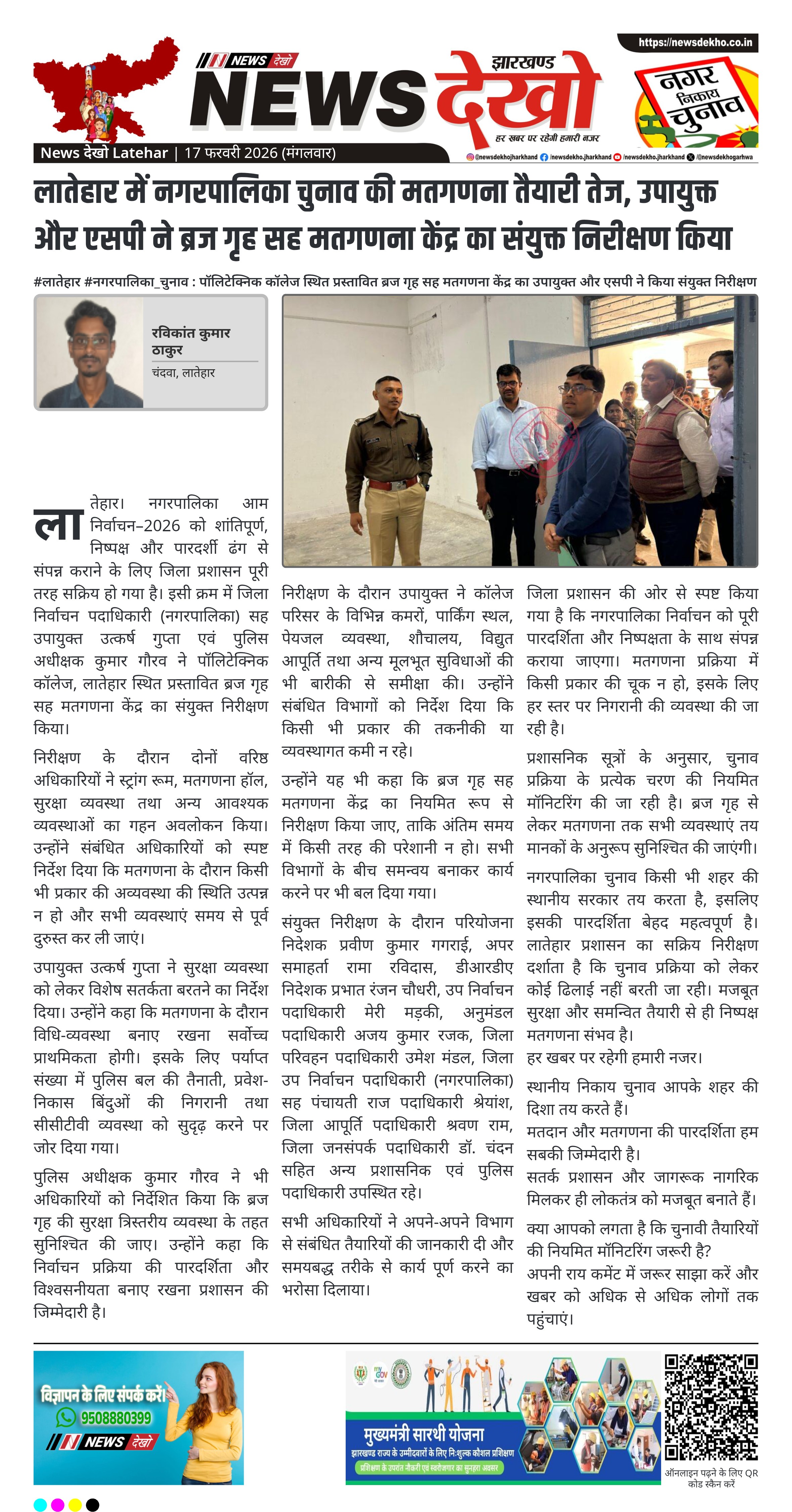 लातेहार। नगरपालिका आम निर्वाचन–2026 को शांतिपूर्ण, निष्पक्ष और पारदर्शी ढंग से संपन्न कराने के लिए जिला प्रशासन पूरी तरह सक्रिय हो गया है। इसी क्रम में जिला निर्वाचन पदाधिकारी (नगरपालिका) सह उपायुक्त उत्कर्ष गुप्ता एवं पुलिस अधीक्षक कुमार गौरव ने पॉलिटेक्निक कॉलेज, लातेहार स्थित प्रस्तावित ब्रज गृह सह मतगणना केंद्र का संयुक्त निरीक्षण किया।