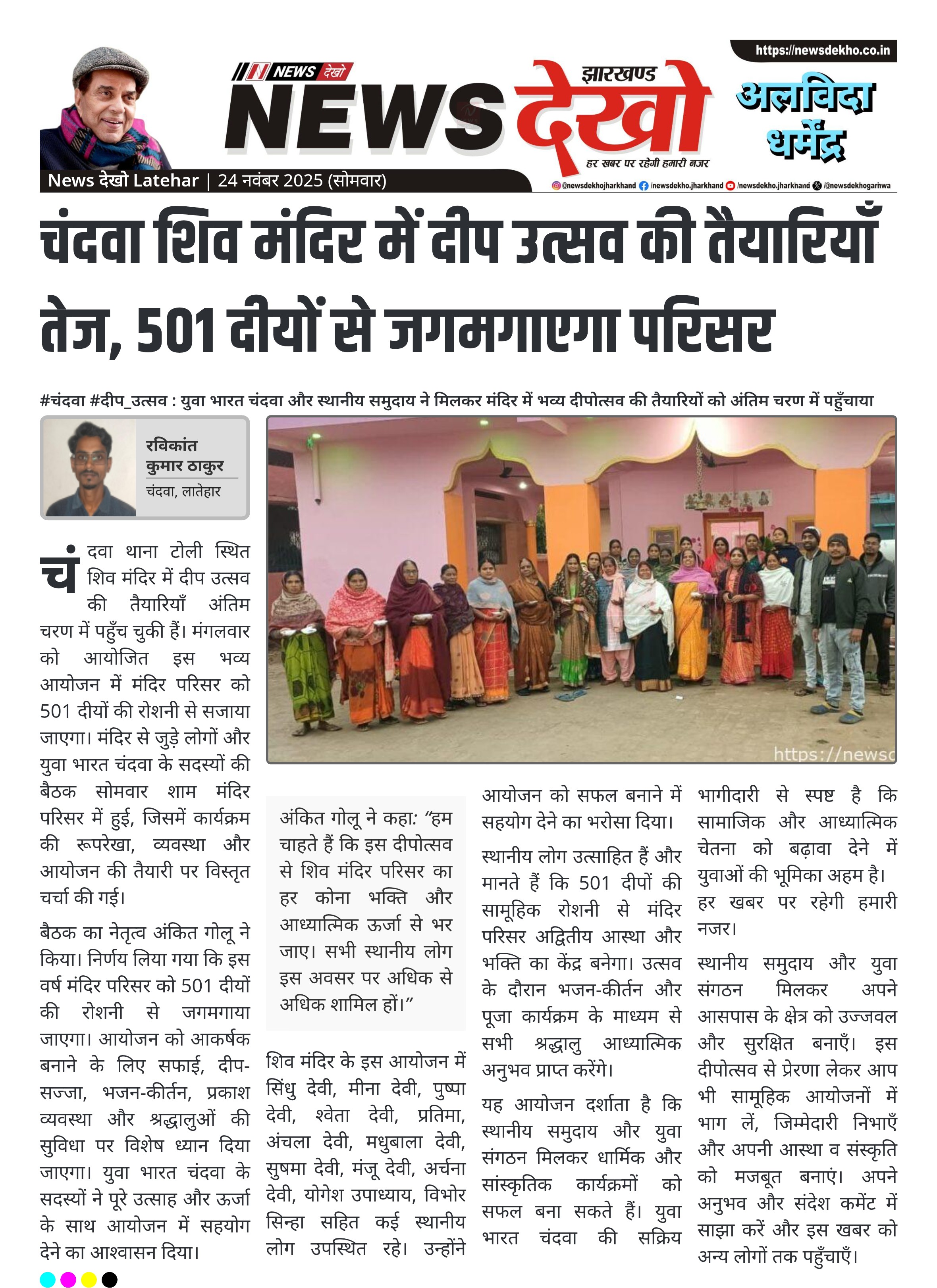 बैठक का नेतृत्व अंकित गोलू ने किया। निर्णय लिया गया कि इस वर्ष मंदिर परिसर को 501 दीयों की रोशनी से जगमगाया जाएगा। आयोजन को आकर्षक बनाने के लिए सफाई, दीप-सज्जा, भजन-कीर्तन, प्रकाश व्यवस्था और श्रद्धालुओं की सुविधा पर विशेष ध्यान दिया जाएगा। युवा भारत चंदवा के सदस्यों ने पूरे उत्साह और ऊर्जा के साथ आयोजन में सहयोग देने का आश्वासन दिया।