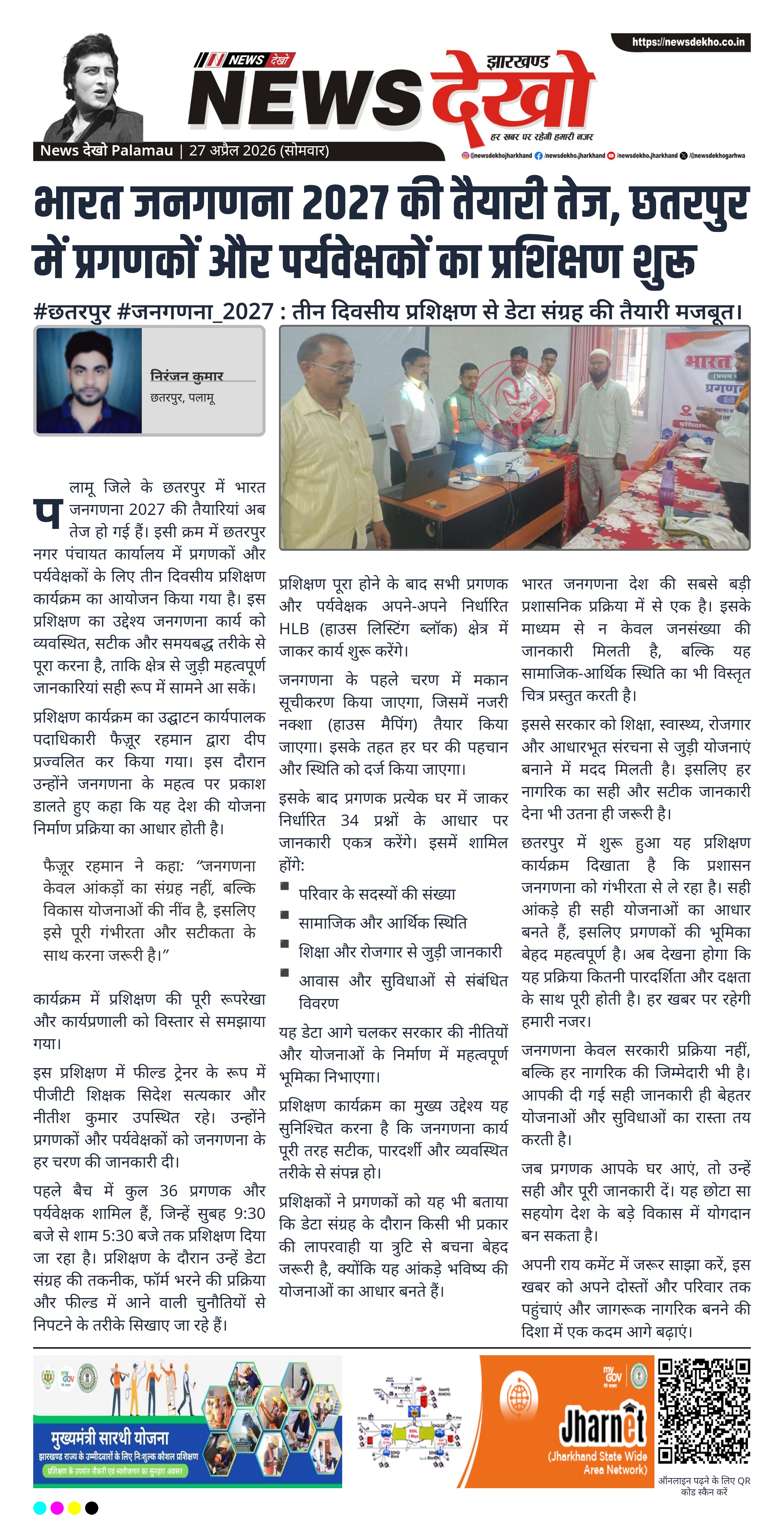 भारत जनगणना 2027 की तैयारियों के तहत पलामू जिले के छतरपुर नगर पंचायत कार्यालय में तीन दिवसीय प्रशिक्षण कार्यक्रम शुरू किया गया। इसमें प्रगणकों और पर्यवेक्षकों को जनगणना की प्रक्रिया और डेटा संग्रह की जानकारी दी जा रही है। प्रशिक्षण के बाद घर-घर जाकर जानकारी एकत्र की जाएगी। यह पहल सटीक और व्यवस्थित जनगणना सुनिश्चित करने के लिए महत्वपूर्ण है।