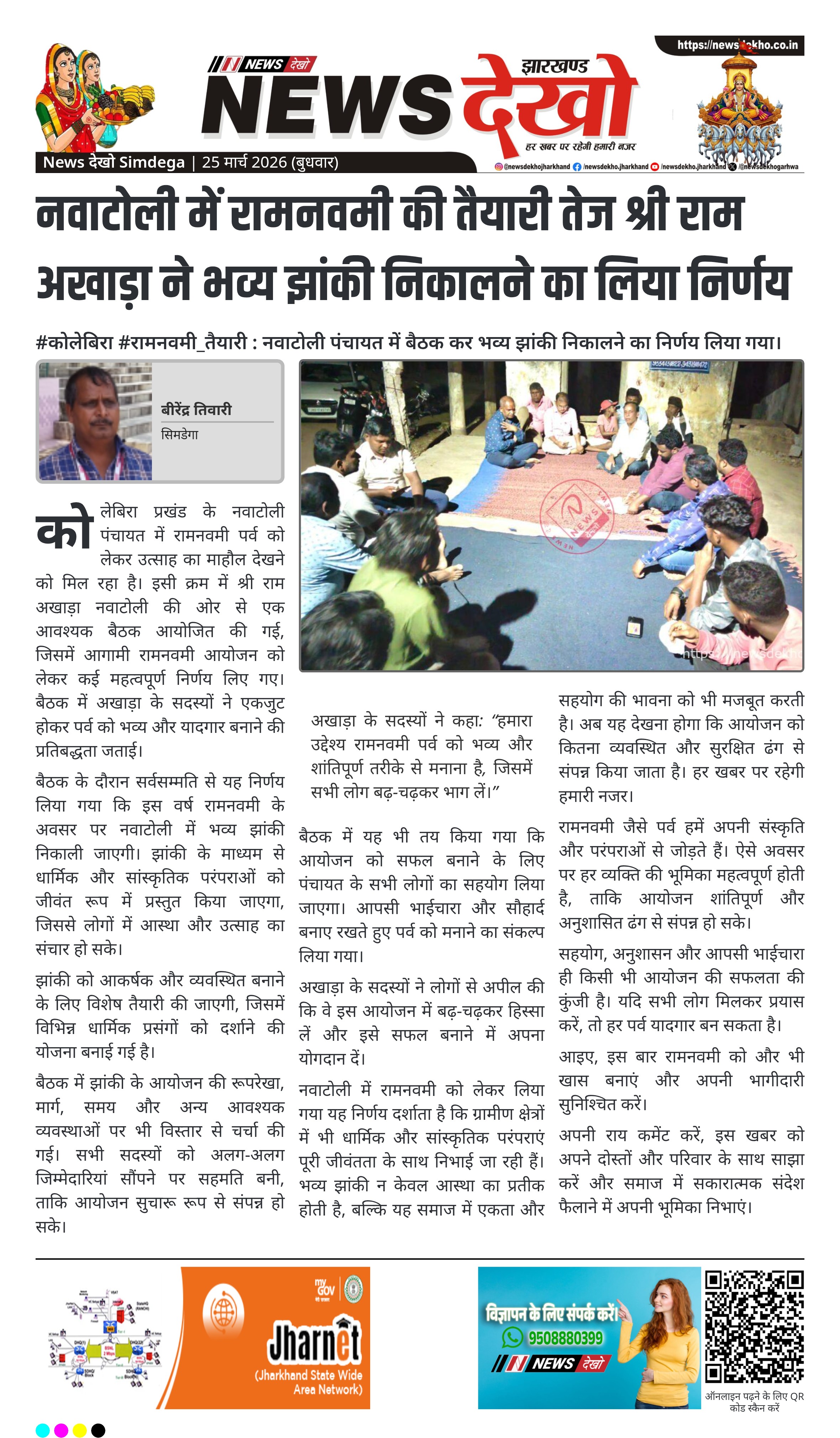 कोलेबिरा प्रखंड के नवाटोली पंचायत में रामनवमी को लेकर तैयारियां तेज हो गई हैं। श्री राम अखाड़ा नवाटोली द्वारा आयोजित बैठक में इस वर्ष भव्य झांकी निकालने का निर्णय लिया गया। बैठक में आयोजन की रूपरेखा और तैयारियों पर विस्तार से चर्चा की गई। पर्व को उत्साह और श्रद्धा के साथ मनाने की दिशा में यह अहम कदम माना जा रहा है।