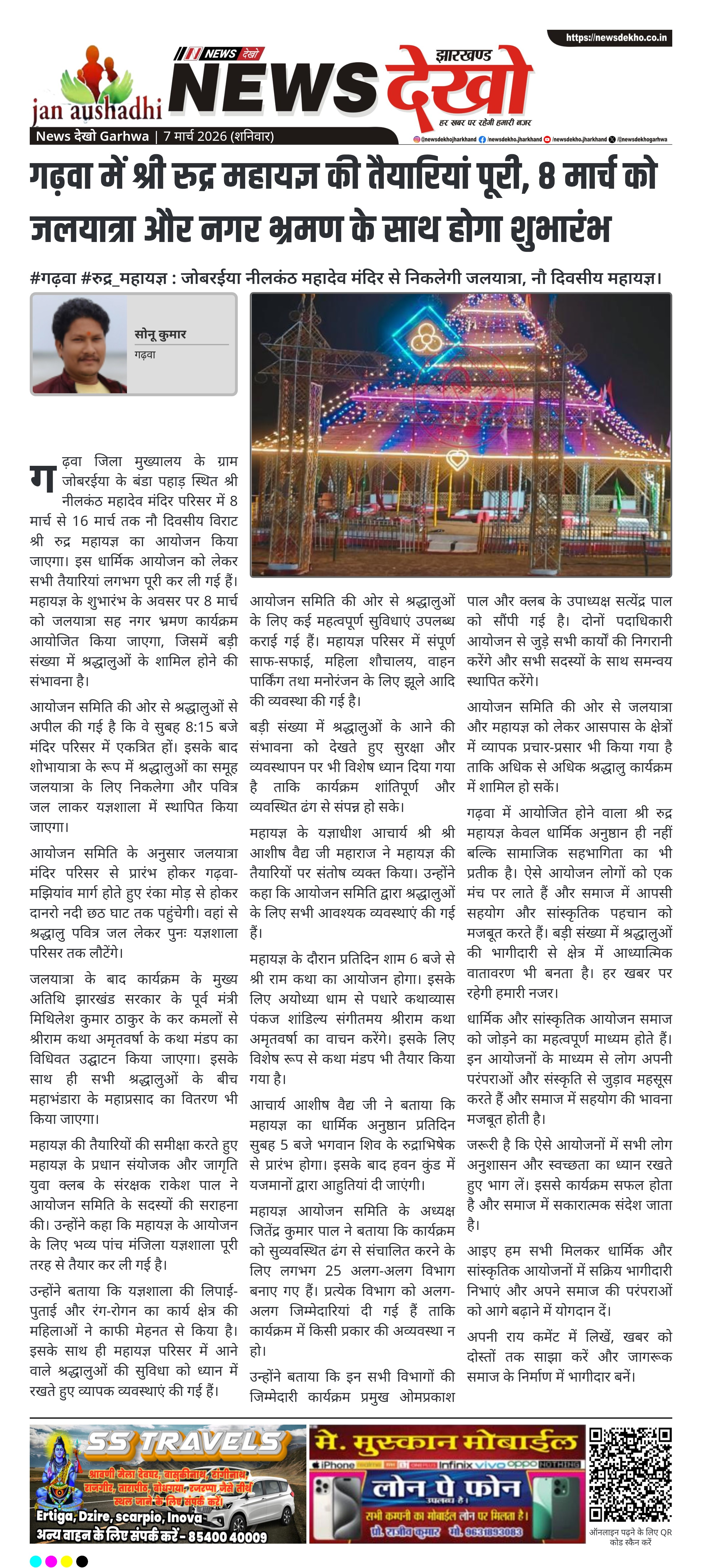 गढ़वा जिला मुख्यालय के ग्राम जोबरईया स्थित बंडा पहाड़ के श्री नीलकंठ महादेव मंदिर परिसर में 8 मार्च से नौ दिवसीय विराट श्री रुद्र महायज्ञ का आयोजन शुरू होगा। कार्यक्रम के पहले दिन जलयात्रा सह नगर भ्रमण निकाला जाएगा। इस अवसर पर पूर्व मंत्री मिथिलेश कुमार ठाकुर मुख्य अतिथि के रूप में शामिल होंगे और कथा मंडप का उद्घाटन करेंगे।