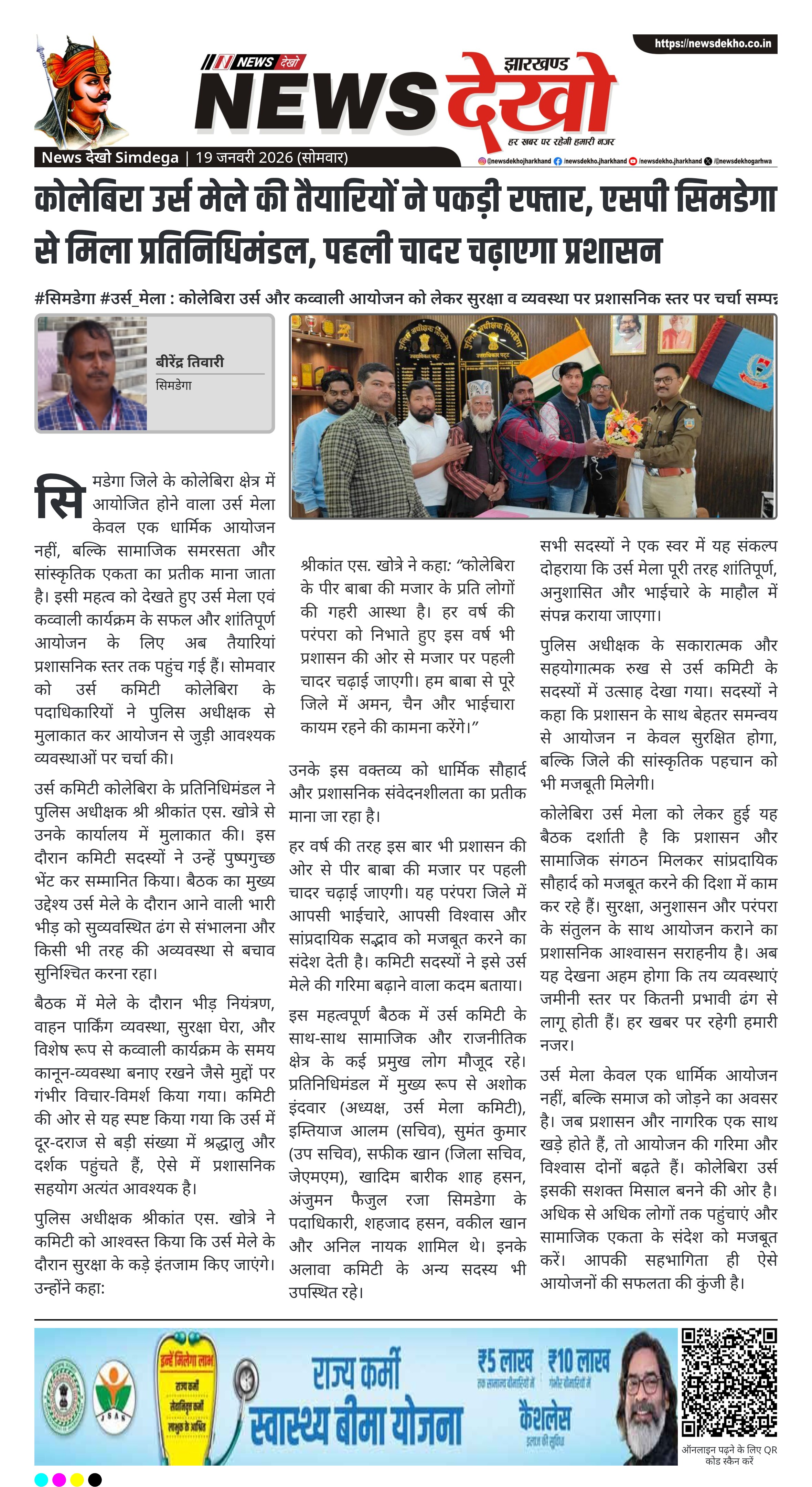 सिमडेगा जिले के प्रसिद्ध कोलेबिरा उर्स मेला एवं कव्वाली कार्यक्रम की तैयारियों को लेकर सोमवार को उर्स कमिटी कोलेबिरा का एक प्रतिनिधिमंडल पुलिस अधीक्षक श्रीकांत एस. खोत्रे से मिला। बैठक में मेले के दौरान सुरक्षा, भीड़ नियंत्रण, पार्किंग और कानून-व्यवस्था जैसे महत्वपूर्ण विषयों पर विस्तार से चर्चा हुई। पुलिस अधीक्षक ने आयोजन के शांतिपूर्ण संचालन का आश्वासन देते हुए प्रशासन की ओर से मजार पर पहली चादर चढ़ाने की परंपरा निभाने की बात कही। इस पहल को जिले में सद्भाव और भाईचारे के संदेश के रूप में देखा जा रहा है।