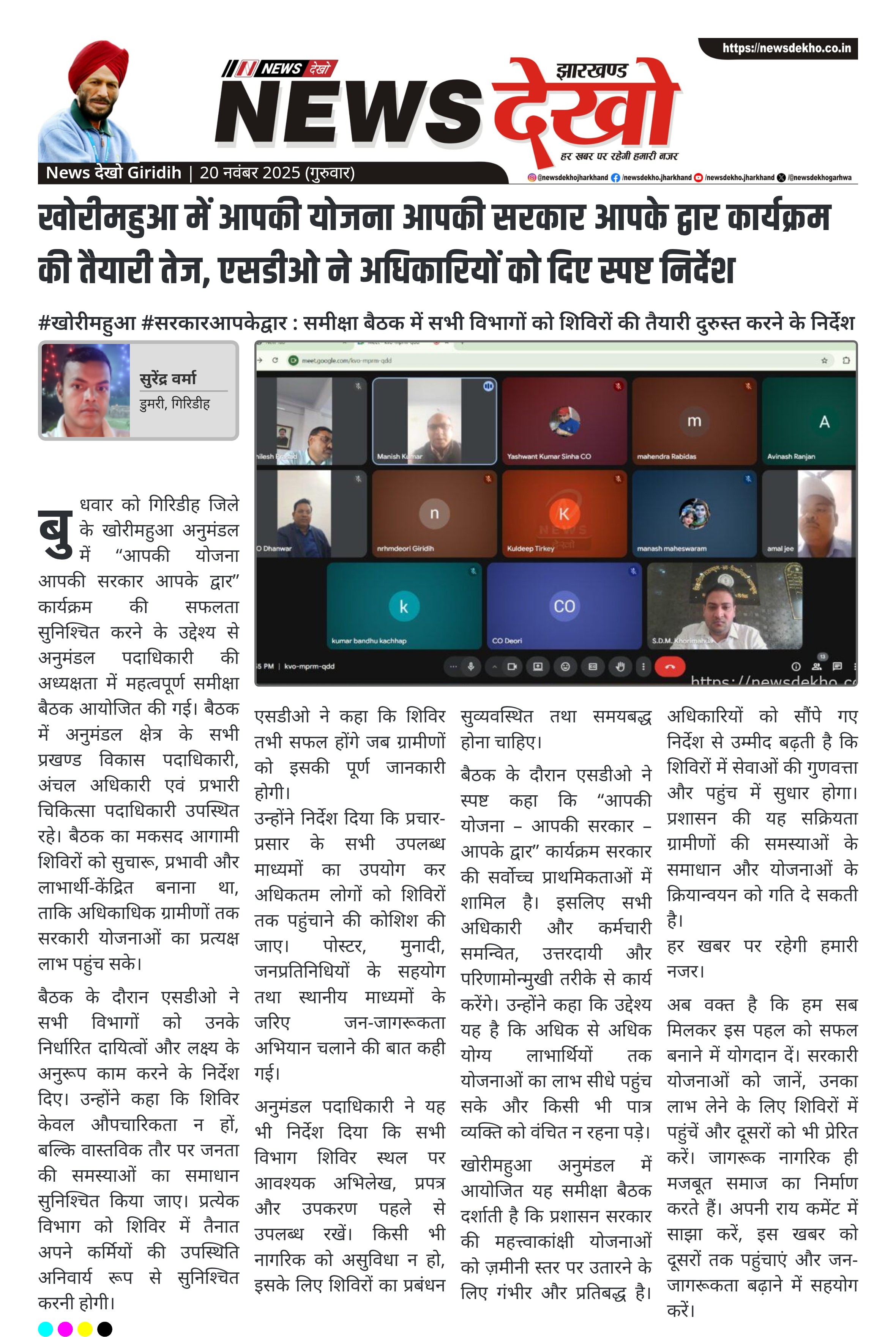 बुधवार को गिरिडीह जिले के खोरीमहुआ अनुमंडल में “आपकी योजना आपकी सरकार आपके द्वार” कार्यक्रम की सफलता सुनिश्चित करने के उद्देश्य से अनुमंडल पदाधिकारी की अध्यक्षता में महत्वपूर्ण समीक्षा बैठक आयोजित की गई। बैठक में अनुमंडल क्षेत्र के सभी प्रखण्ड विकास पदाधिकारी, अंचल अधिकारी एवं प्रभारी चिकित्सा पदाधिकारी उपस्थित रहे। बैठक का मकसद आगामी शिविरों को सुचारू, प्रभावी और लाभार्थी-केंद्रित बनाना था, ताकि अधिकाधिक ग्रामीणों तक सरकारी योजनाओं का प्रत्यक्ष लाभ पहुंच सके।