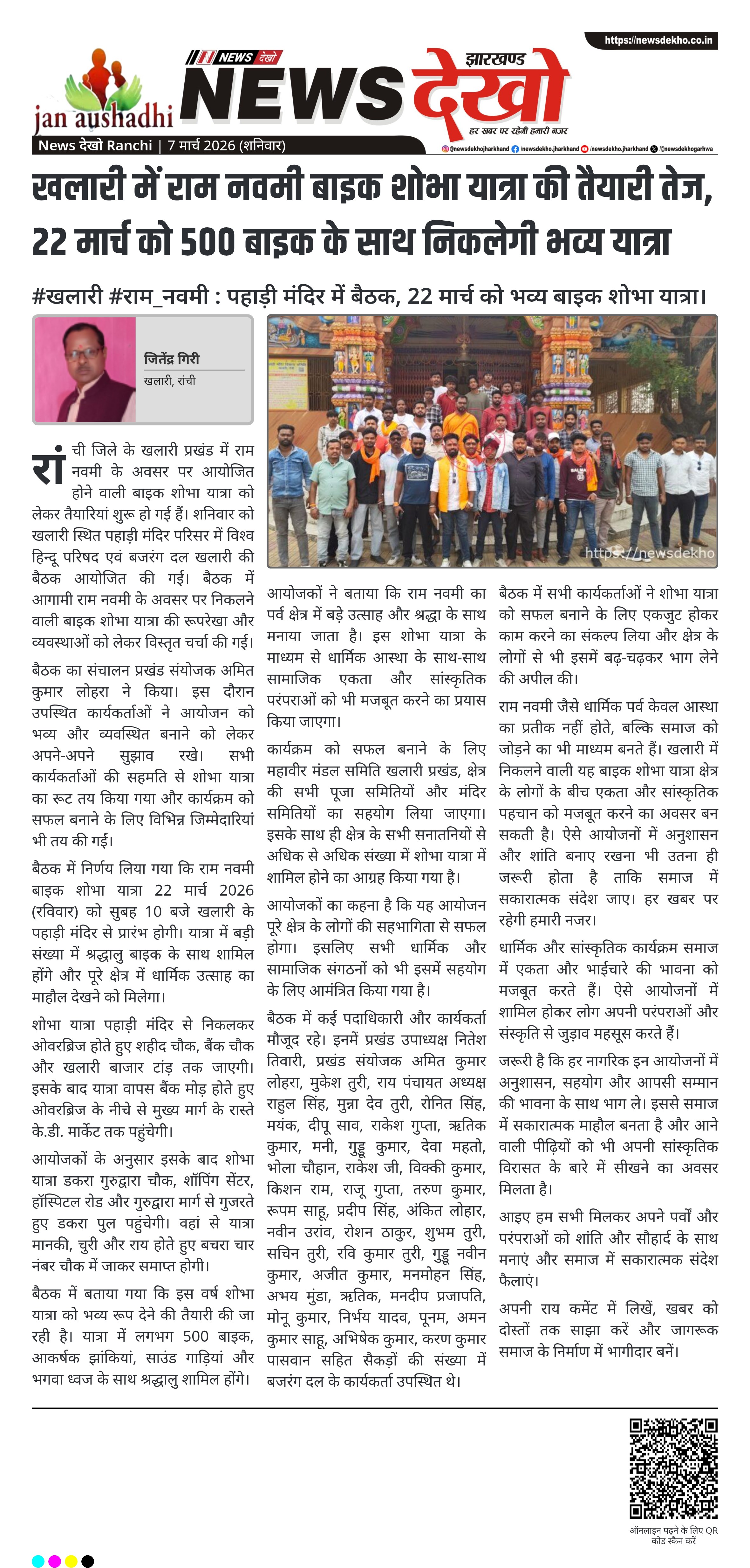 राम नवमी जैसे धार्मिक पर्व केवल आस्था का प्रतीक नहीं होते, बल्कि समाज को जोड़ने का भी माध्यम बनते हैं। खलारी में निकलने वाली यह बाइक शोभा यात्रा क्षेत्र के लोगों के बीच एकता और सांस्कृतिक पहचान को मजबूत करने का अवसर बन सकती है। ऐसे आयोजनों में अनुशासन और शांति बनाए रखना भी उतना ही जरूरी होता है ताकि समाज में सकारात्मक संदेश जाए। हर खबर पर रहेगी हमारी नजर।