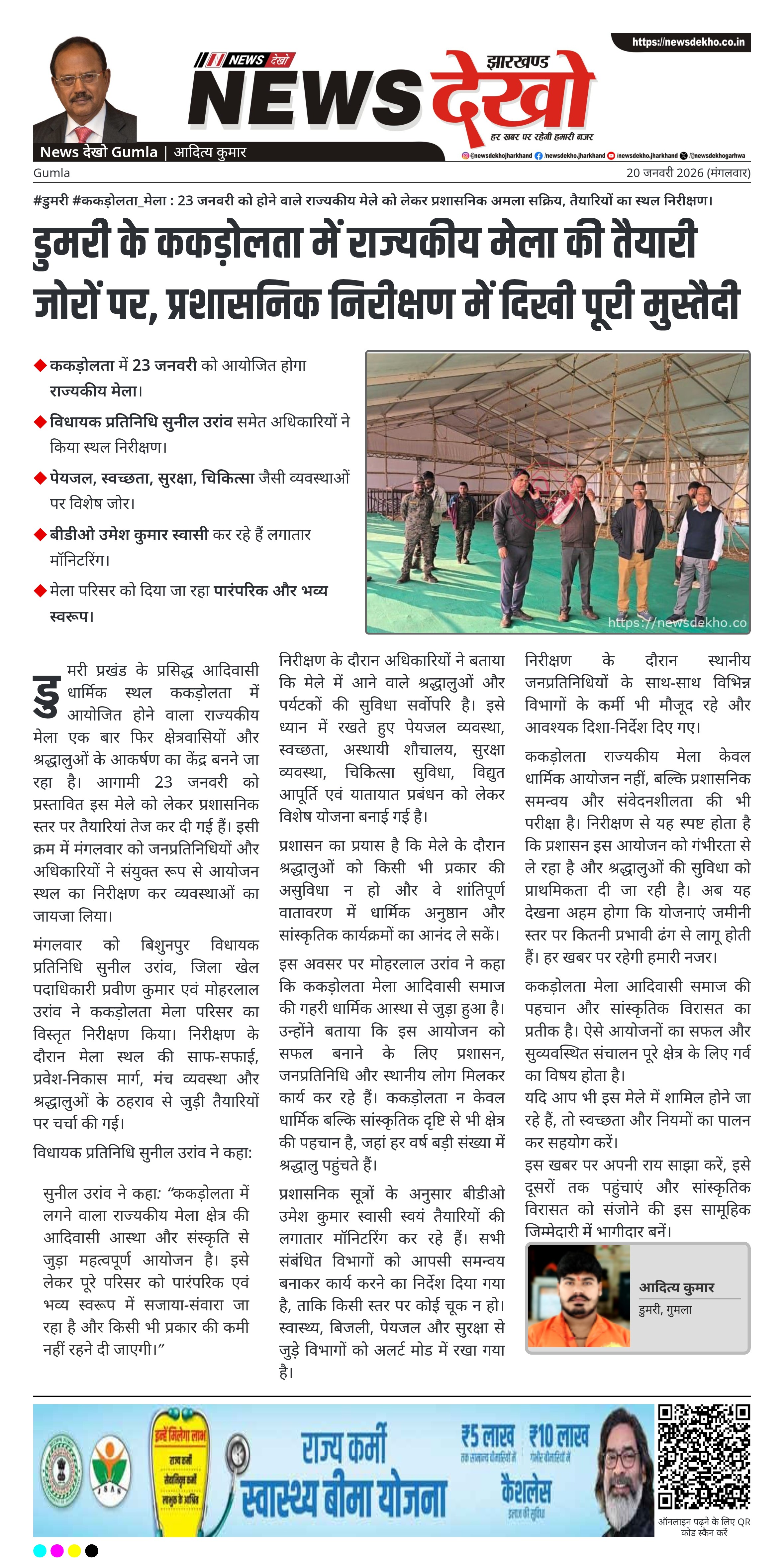 डुमरी प्रखंड स्थित प्रसिद्ध आदिवासी धार्मिक स्थल ककड़ोलता परिसर में 23 जनवरी को आयोजित होने वाले राज्यकीय मेले की तैयारियों को लेकर प्रशासन सक्रिय हो गया है। मंगलवार को बिशुनपुर विधायक प्रतिनिधि सुनील उरांव, जिला खेल पदाधिकारी प्रवीण कुमार और मोहरलाल उरांव ने संयुक्त रूप से मेले के आयोजन स्थल का निरीक्षण किया। निरीक्षण के दौरान मूलभूत सुविधाओं, सुरक्षा और व्यवस्थाओं की समीक्षा की गई। यह मेला क्षेत्र की आदिवासी आस्था और संस्कृति से जुड़ा महत्वपूर्ण आयोजन माना जाता है।