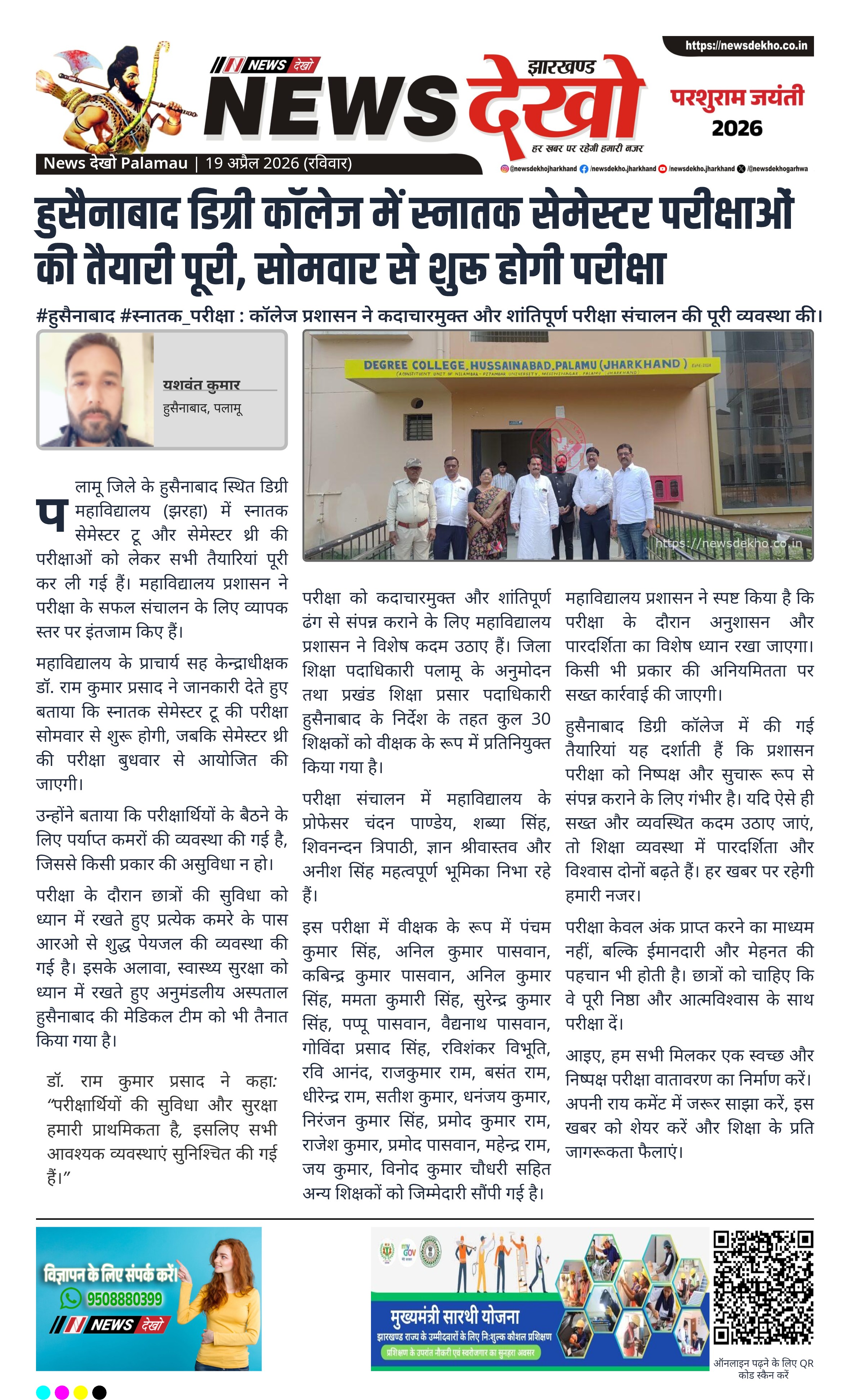 पलामू जिले के हुसैनाबाद स्थित डिग्री महाविद्यालय (झरहा) में स्नातक सेमेस्टर टू और सेमेस्टर थ्री की परीक्षाओं को लेकर सभी तैयारियां पूरी कर ली गई हैं। महाविद्यालय प्रशासन ने परीक्षा के सफल संचालन के लिए व्यापक स्तर पर इंतजाम किए हैं।