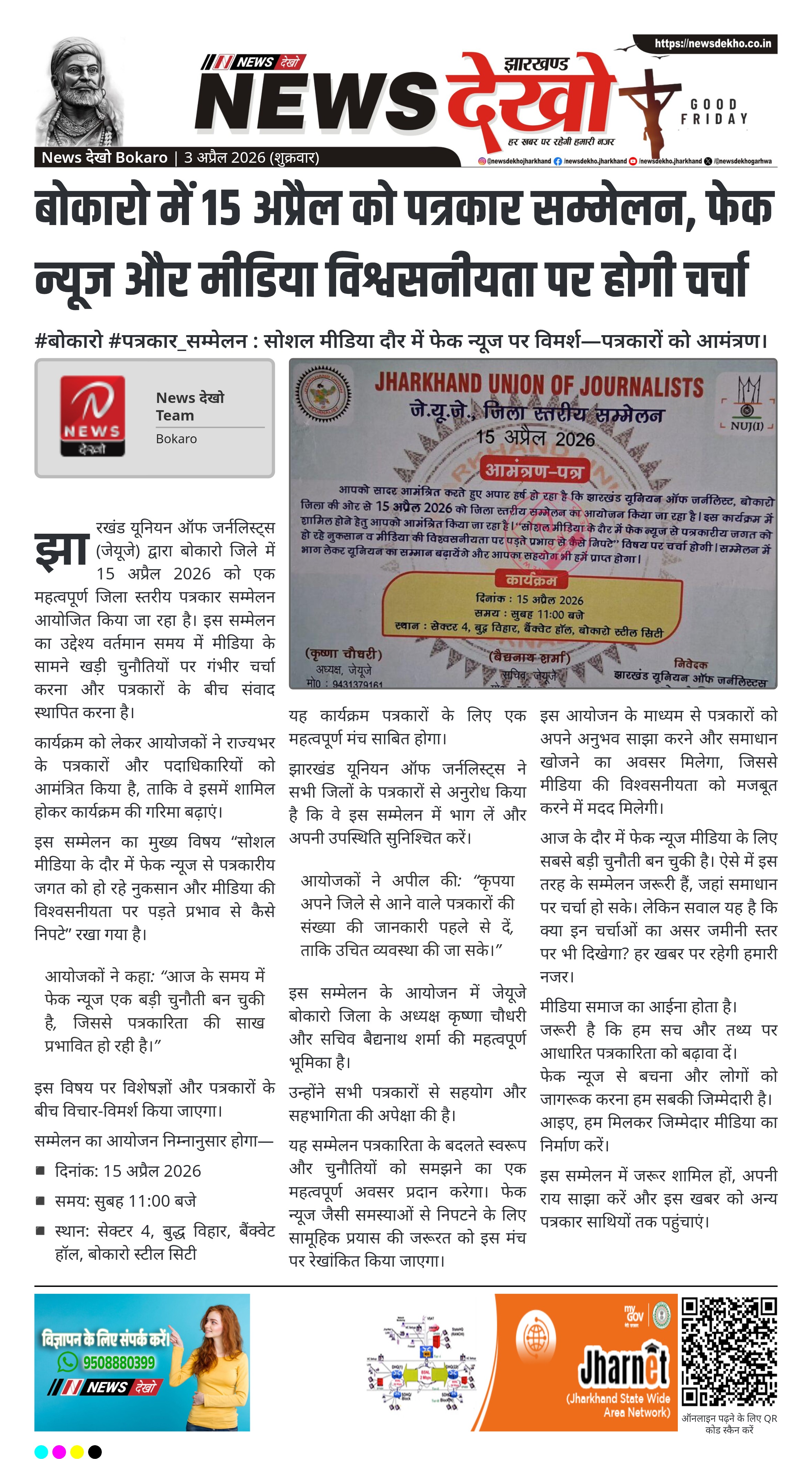 बोकारो में 15 अप्रैल 2026 को झारखंड यूनियन ऑफ जर्नलिस्ट्स द्वारा जिला स्तरीय सम्मेलन आयोजित किया जाएगा। सम्मेलन में फेक न्यूज और मीडिया की विश्वसनीयता जैसे महत्वपूर्ण विषयों पर चर्चा होगी। कार्यक्रम सेक्टर 4 बुद्ध विहार बैंक्वेट हॉल में आयोजित होगा। इसमें राज्यभर के पत्रकारों को आमंत्रित किया गया है।