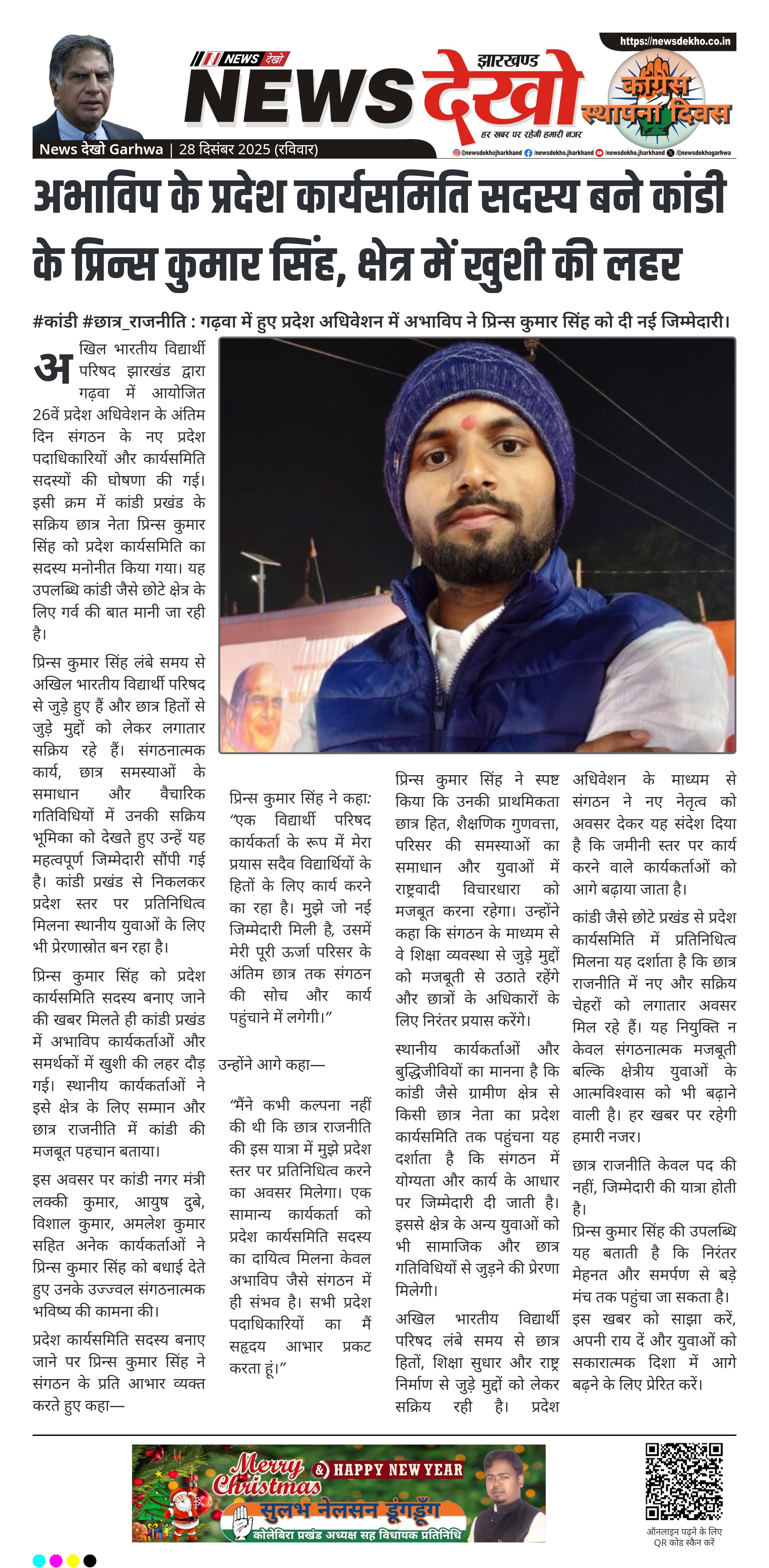 - प्रिन्स कुमार सिंह को अभाविप झारखंड का प्रदेश कार्यसमिति सदस्य बनाया गया।