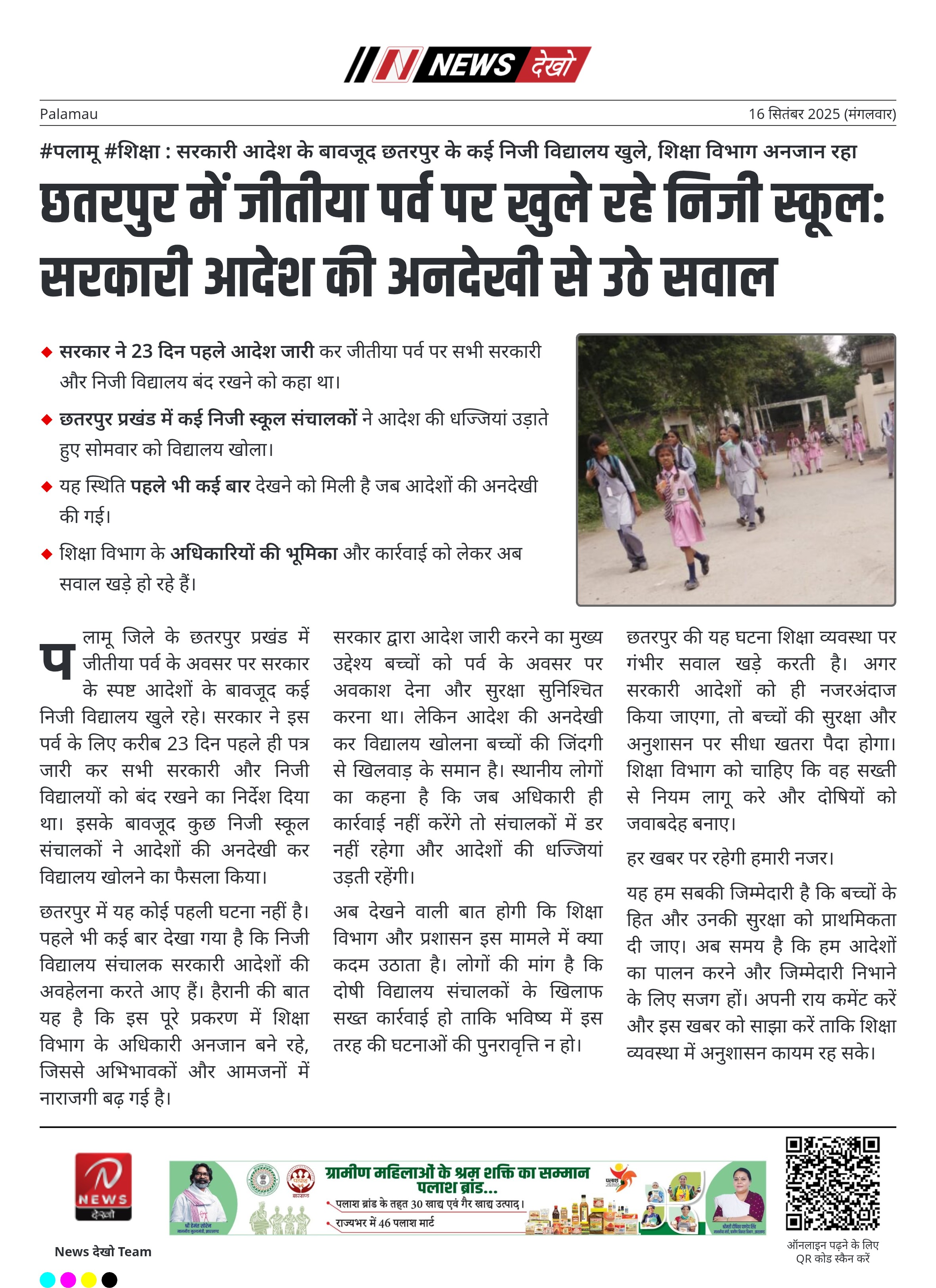 पलामू जिले के छतरपुर प्रखंड में जीतीया पर्व के अवसर पर सरकार के स्पष्ट आदेशों के बावजूद कई निजी विद्यालय खुले रहे। सरकार ने इस पर्व के लिए करीब 23 दिन पहले ही पत्र जारी कर सभी सरकारी और निजी विद्यालयों को बंद रखने का निर्देश दिया था। इसके बावजूद कुछ निजी स्कूल संचालकों ने आदेशों की अनदेखी कर विद्यालय खोलने का फैसला किया।