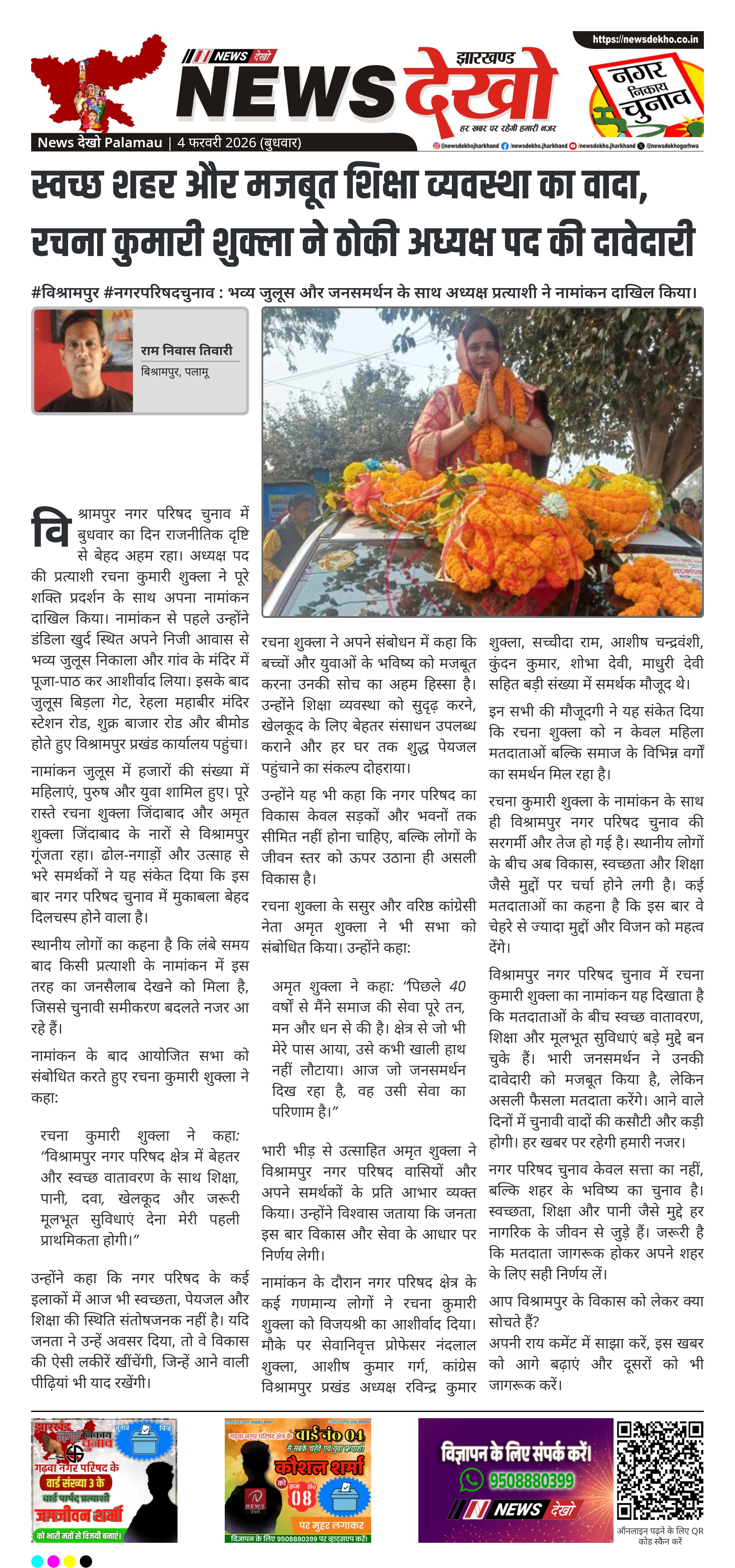 पलामू जिले के विश्रामपुर नगर परिषद क्षेत्र में चुनावी माहौल तेज हो गया है। नगर परिषद अध्यक्ष पद की प्रत्याशी रचना कुमारी शुक्ला ने गुरुवार को भव्य जुलूस और धार्मिक अनुष्ठान के बाद नामांकन दाखिल किया। हजारों की संख्या में महिला, पुरुष और युवा समर्थकों की मौजूदगी ने उनकी दावेदारी को मजबूत बनाया। उन्होंने स्वच्छ वातावरण, शिक्षा और पानी को अपनी पहली प्राथमिकता बताया।