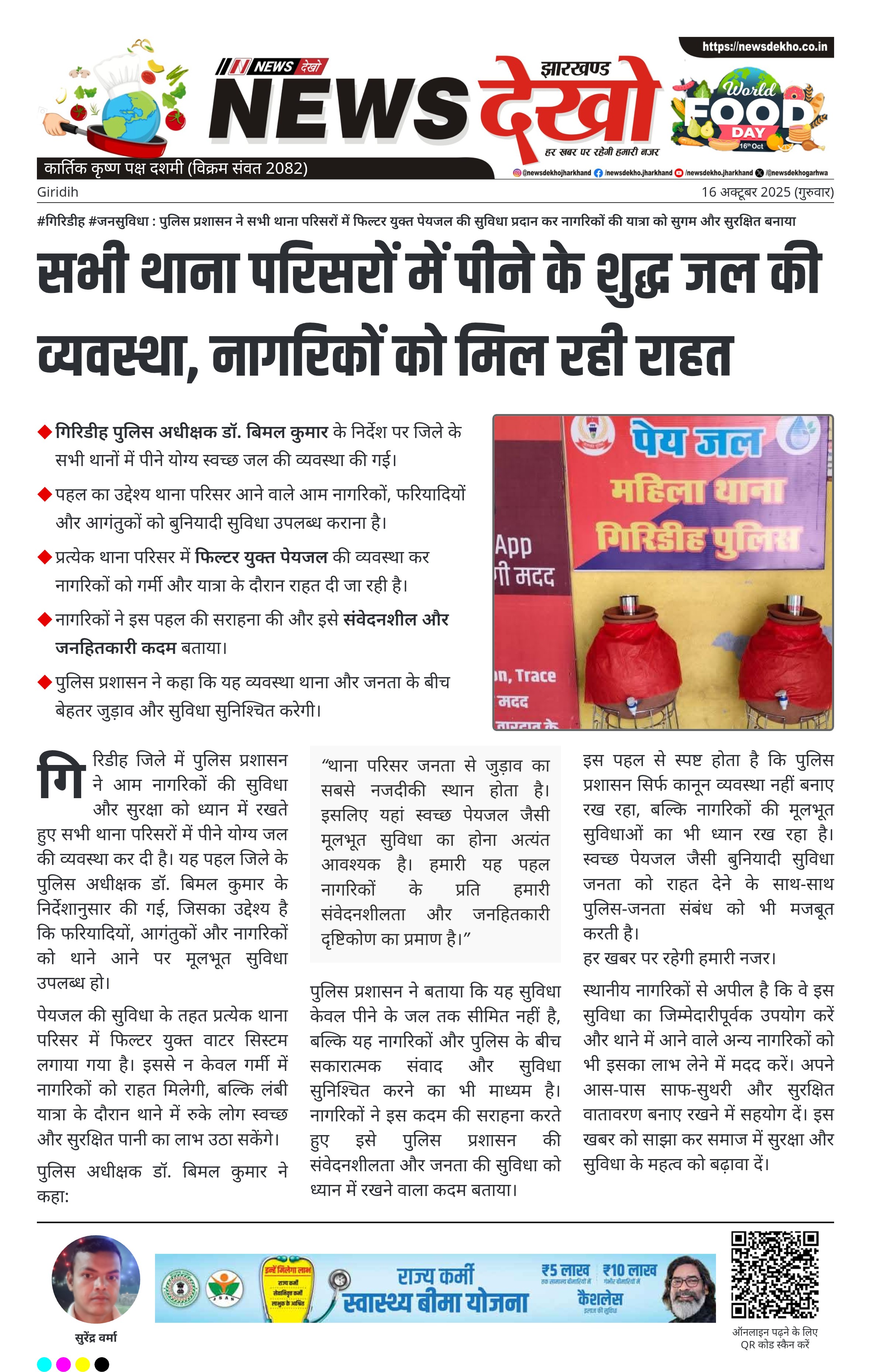 - गिरिडीह पुलिस अधीक्षक डॉ. बिमल कुमार के निर्देश पर जिले के सभी थानों में पीने योग्य स्वच्छ जल की व्यवस्था की गई।