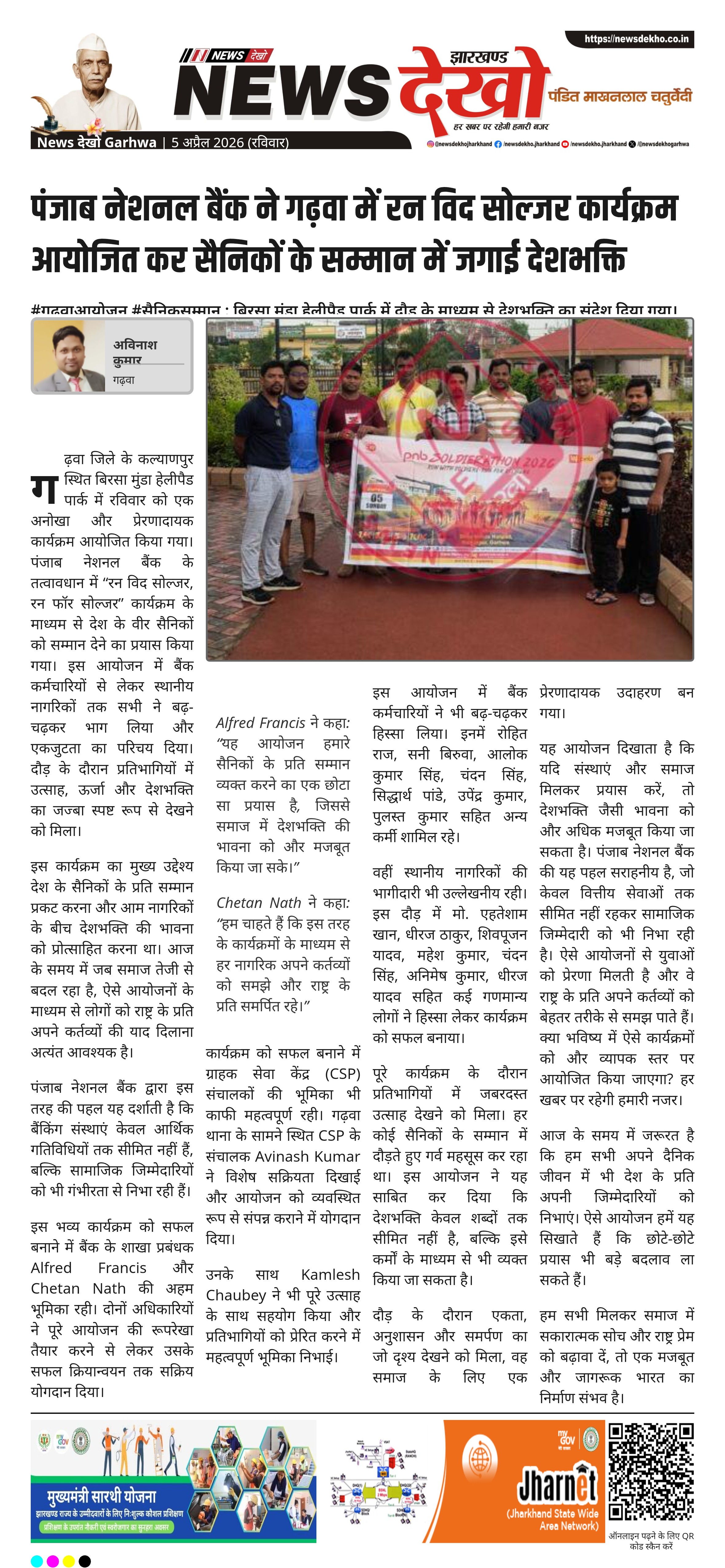 गढ़वा के कल्याणपुर स्थित बिरसा मुंडा हेलीपैड पार्क में 5 अप्रैल 2026 को पंजाब नेशनल बैंक द्वारा “रन विद सोल्जर, रन फॉर सोल्जर” कार्यक्रम आयोजित किया गया। इस आयोजन में बैंक कर्मियों, ग्राहकों और स्थानीय नागरिकों ने भाग लेकर सैनिकों के प्रति सम्मान व्यक्त किया। कार्यक्रम का उद्देश्य समाज में देशभक्ति की भावना को मजबूत करना था। आयोजन में बड़ी संख्या में लोगों की सक्रिय भागीदारी देखी गई, जिससे एक सकारात्मक संदेश प्रसारित हुआ।