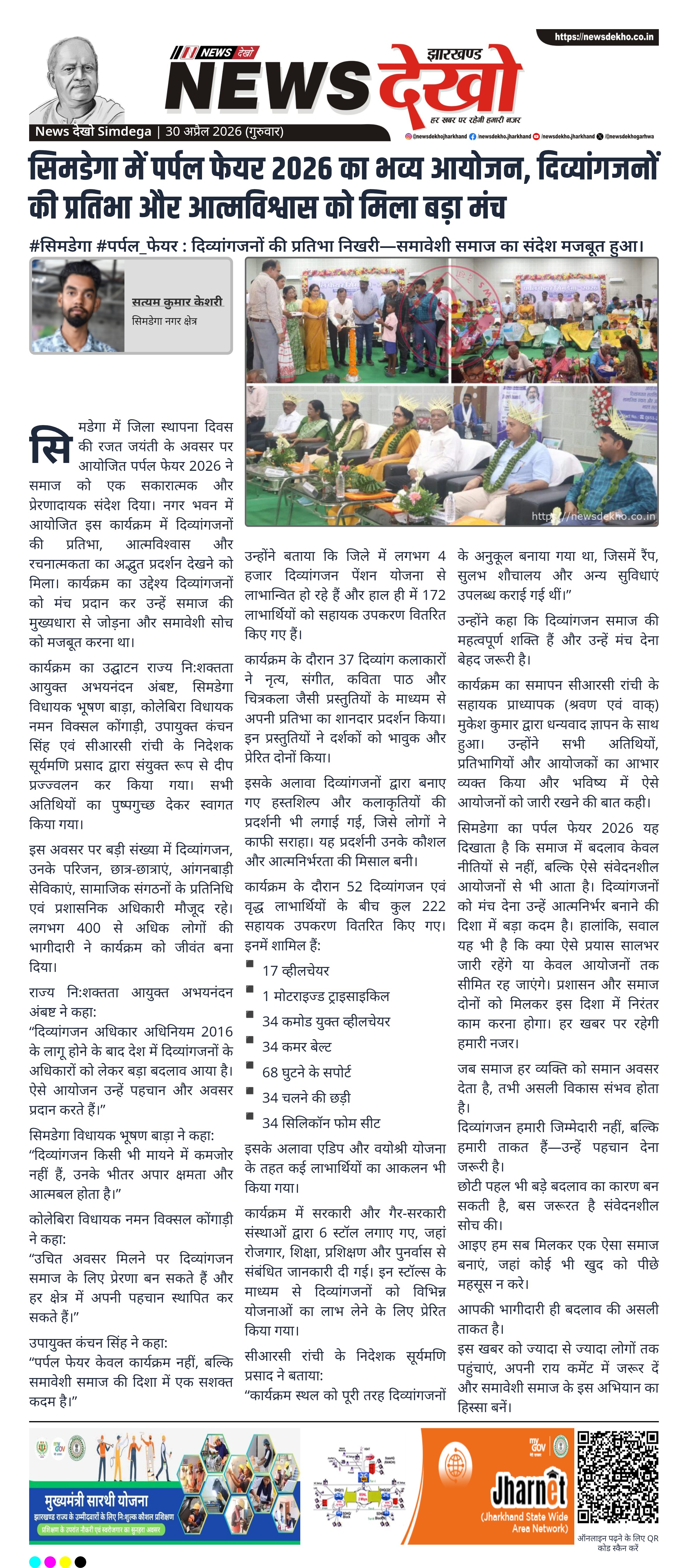 सिमडेगा में जिला स्थापना दिवस की रजत जयंती पर पर्पल फेयर 2026 का आयोजन किया गया, जिसमें दिव्यांगजनों को अपनी प्रतिभा दिखाने का मंच मिला। कार्यक्रम में जनप्रतिनिधियों और अधिकारियों की मौजूदगी रही तथा सहायक उपकरणों का वितरण किया गया। सांस्कृतिक प्रस्तुतियों और प्रदर्शनी ने लोगों को प्रभावित किया। यह आयोजन समावेशी समाज की दिशा में महत्वपूर्ण पहल के रूप में देखा जा रहा है।