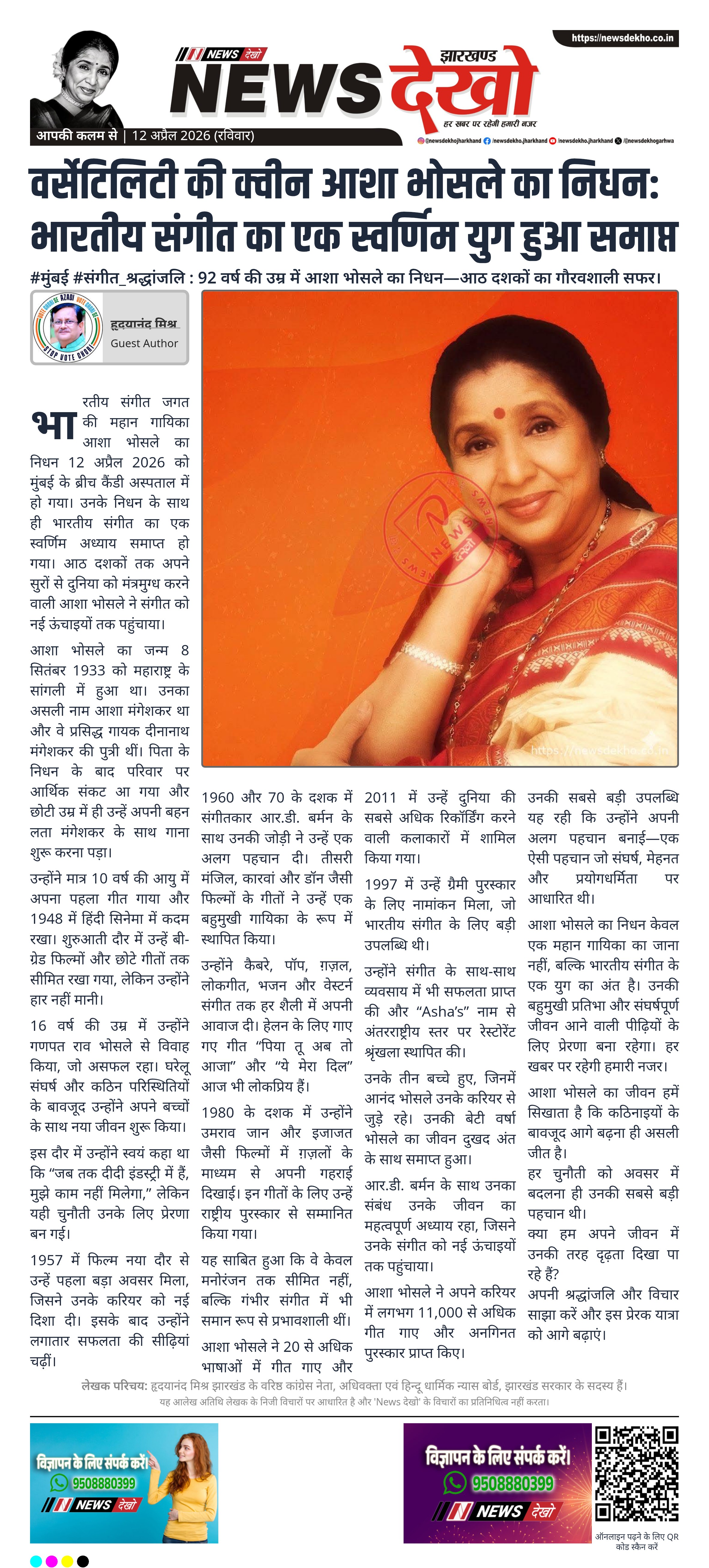 भारतीय संगीत जगत की महान गायिका आशा भोसले का निधन 12 अप्रैल 2026 को मुंबई के ब्रीच कैंडी अस्पताल में हो गया। उनके निधन के साथ ही भारतीय संगीत का एक स्वर्णिम अध्याय समाप्त हो गया। आठ दशकों तक अपने सुरों से दुनिया को मंत्रमुग्ध करने वाली आशा भोसले ने संगीत को नई ऊंचाइयों तक पहुंचाया।