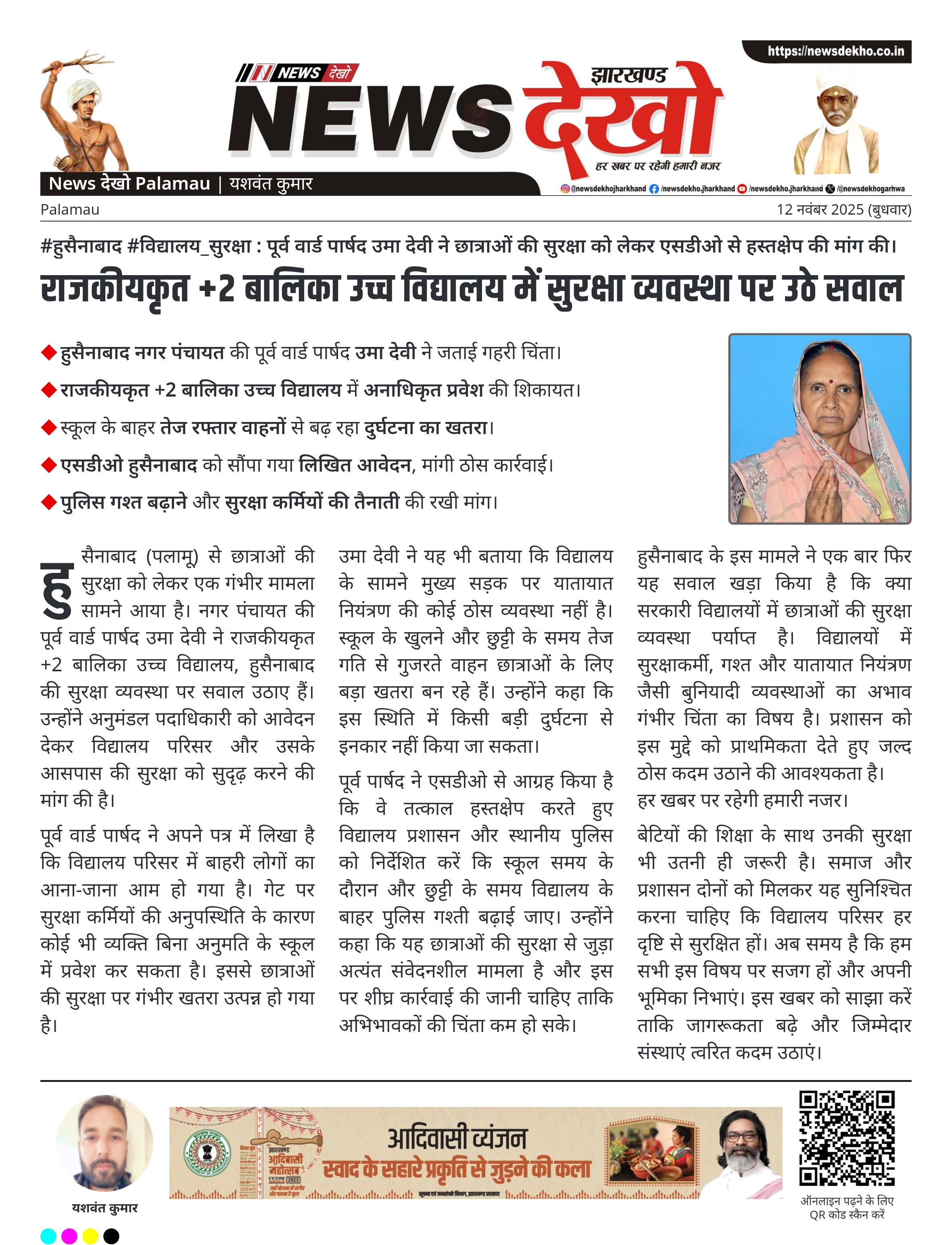 #हुसैनाबाद #विद्यालय_सुरक्षा : पूर्व वार्ड पार्षद उमा देवी ने छात्राओं की सुरक्षा को लेकर एसडीओ से हस्तक्षेप की मांग की।
