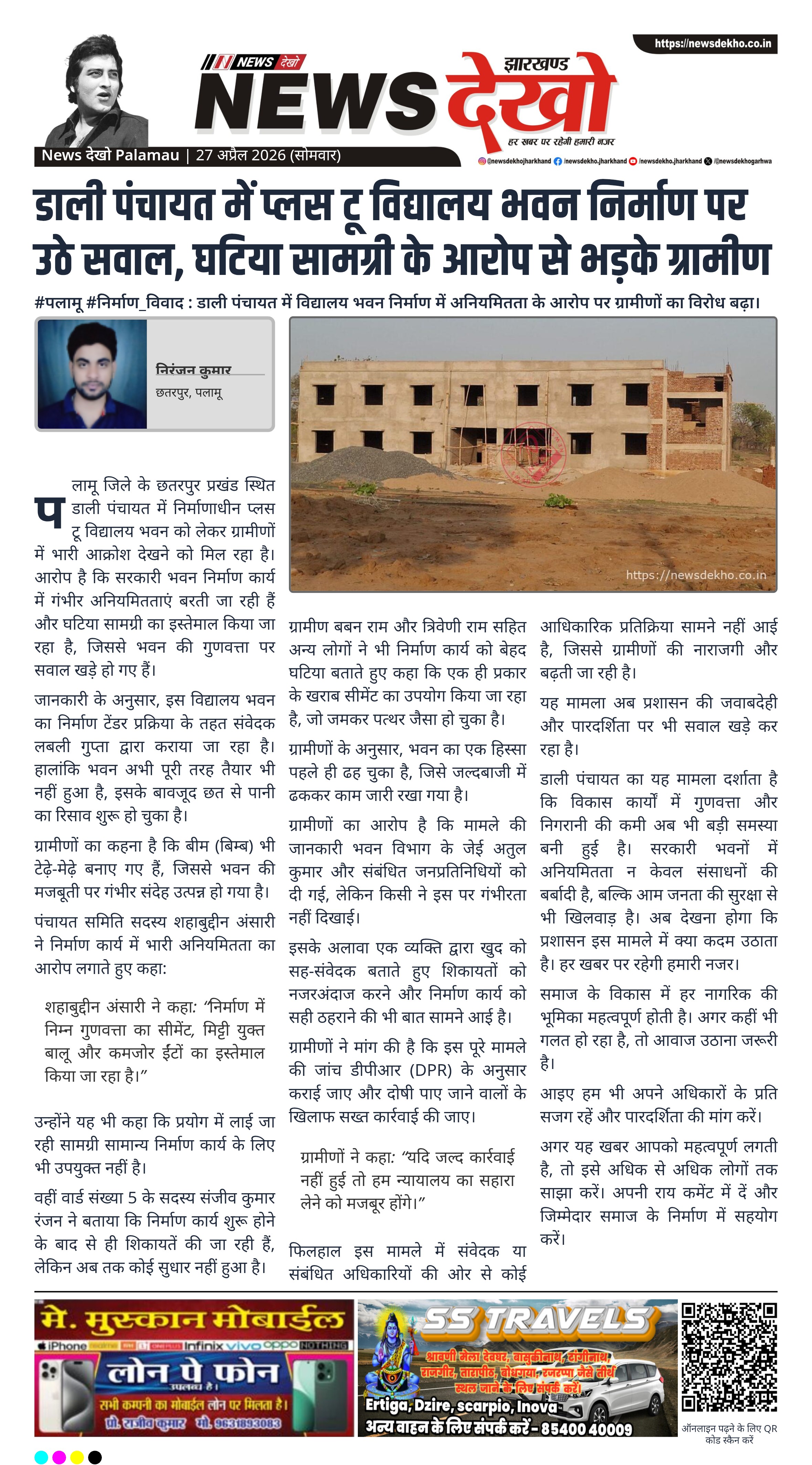 पलामू जिले के छतरपुर प्रखंड स्थित डाली पंचायत में निर्माणाधीन प्लस टू विद्यालय भवन को लेकर ग्रामीणों में भारी आक्रोश देखने को मिल रहा है। आरोप है कि सरकारी भवन निर्माण कार्य में गंभीर अनियमितताएं बरती जा रही हैं और घटिया सामग्री का इस्तेमाल किया जा रहा है, जिससे भवन की गुणवत्ता पर सवाल खड़े हो गए हैं।