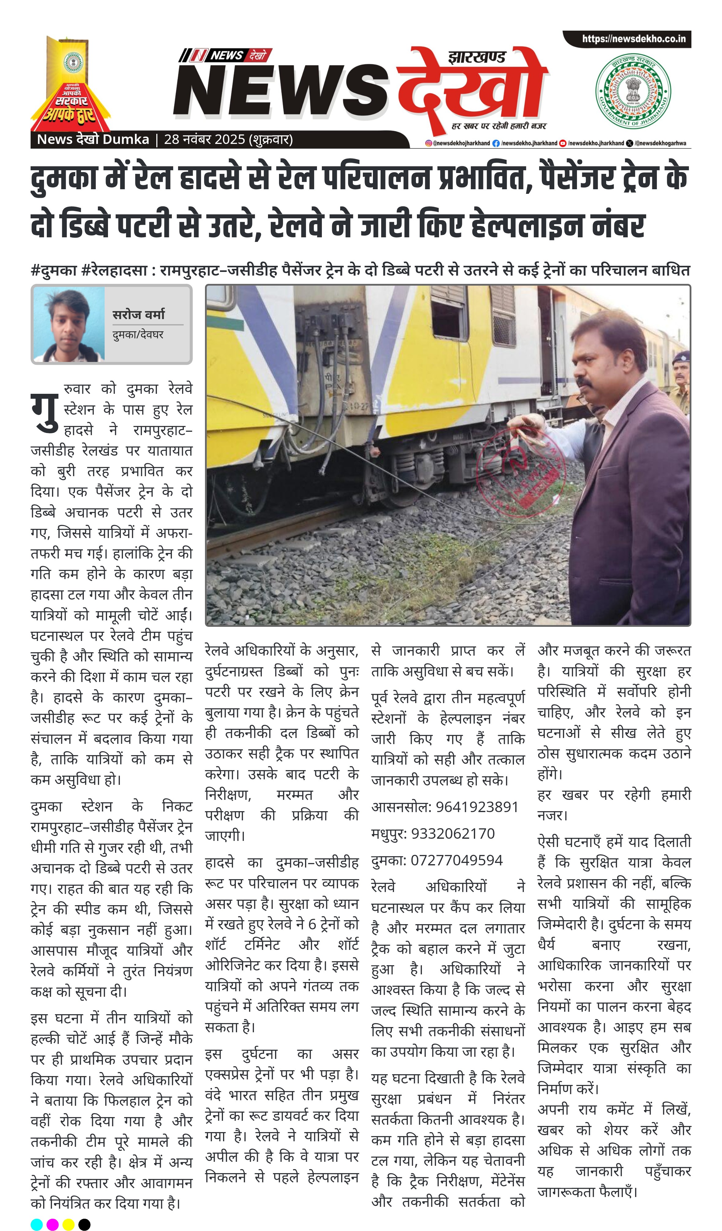 - दुमका स्टेशन के पास रामपुरहाट–जसीडीह पैसेंजर के दो डिब्बे पटरी से उतरे।