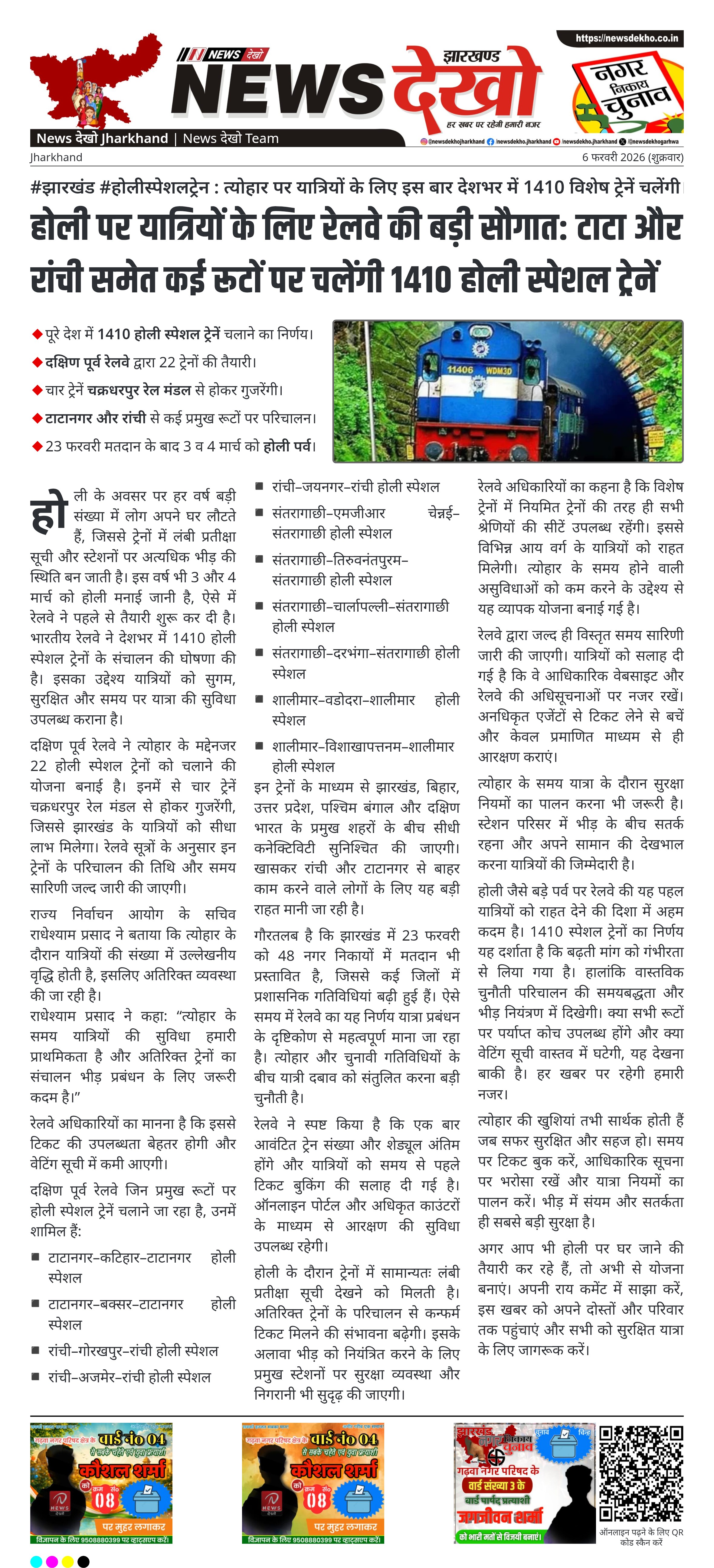 गौरतलब है कि झारखंड में 23 फरवरी को 48 नगर निकायों में मतदान भी प्रस्तावित है, जिससे कई जिलों में प्रशासनिक गतिविधियां बढ़ी हुई हैं। ऐसे समय में रेलवे का यह निर्णय यात्रा प्रबंधन के दृष्टिकोण से महत्वपूर्ण माना जा रहा है। त्योहार और चुनावी गतिविधियों के बीच यात्री दबाव को संतुलित करना बड़ी चुनौती है।