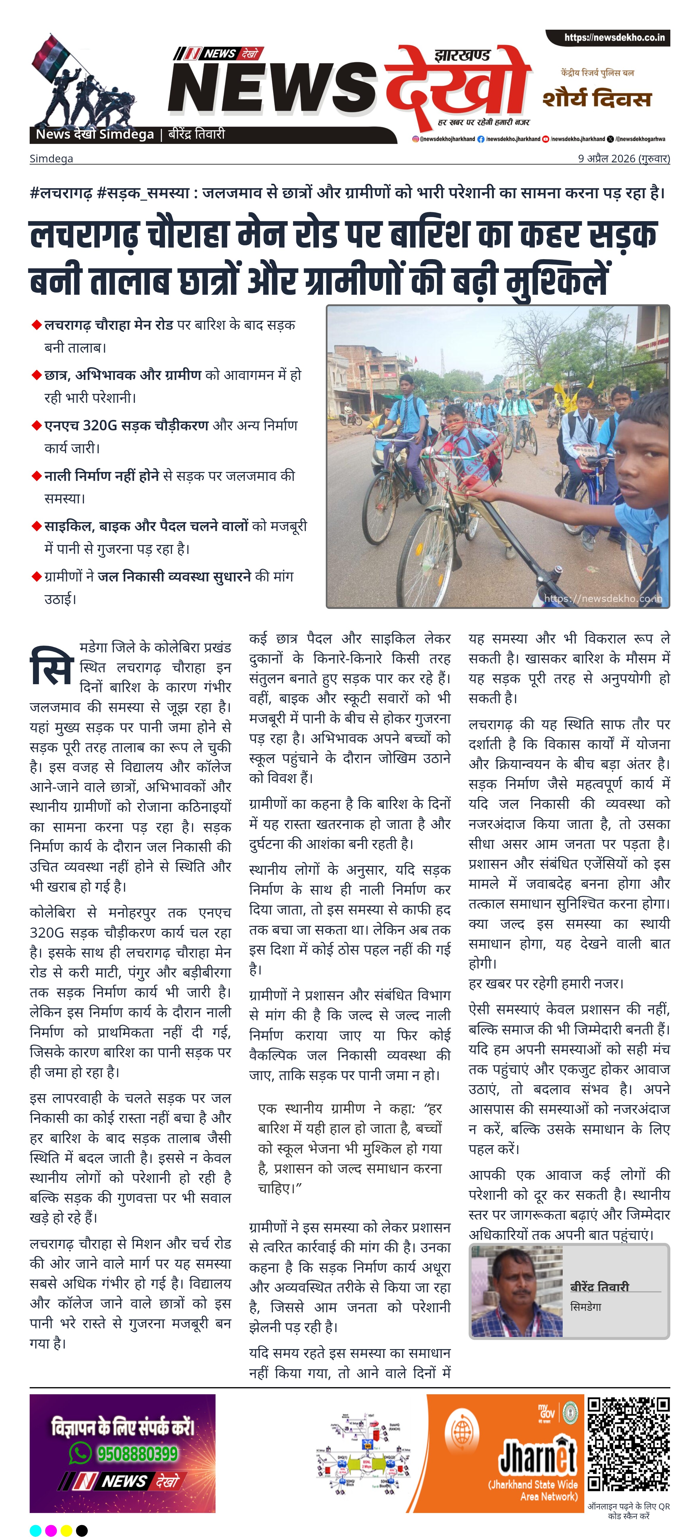 सिमडेगा जिले के कोलेबिरा प्रखंड स्थित लचरागढ़ चौराहा इन दिनों बारिश के कारण गंभीर जलजमाव की समस्या से जूझ रहा है। यहां मुख्य सड़क पर पानी जमा होने से सड़क पूरी तरह तालाब का रूप ले चुकी है। इस वजह से विद्यालय और कॉलेज आने-जाने वाले छात्रों, अभिभावकों और स्थानीय ग्रामीणों को रोजाना कठिनाइयों का सामना करना पड़ रहा है। सड़क निर्माण कार्य के दौरान जल निकासी की उचित व्यवस्था नहीं होने से स्थिति और भी खराब हो गई है।
