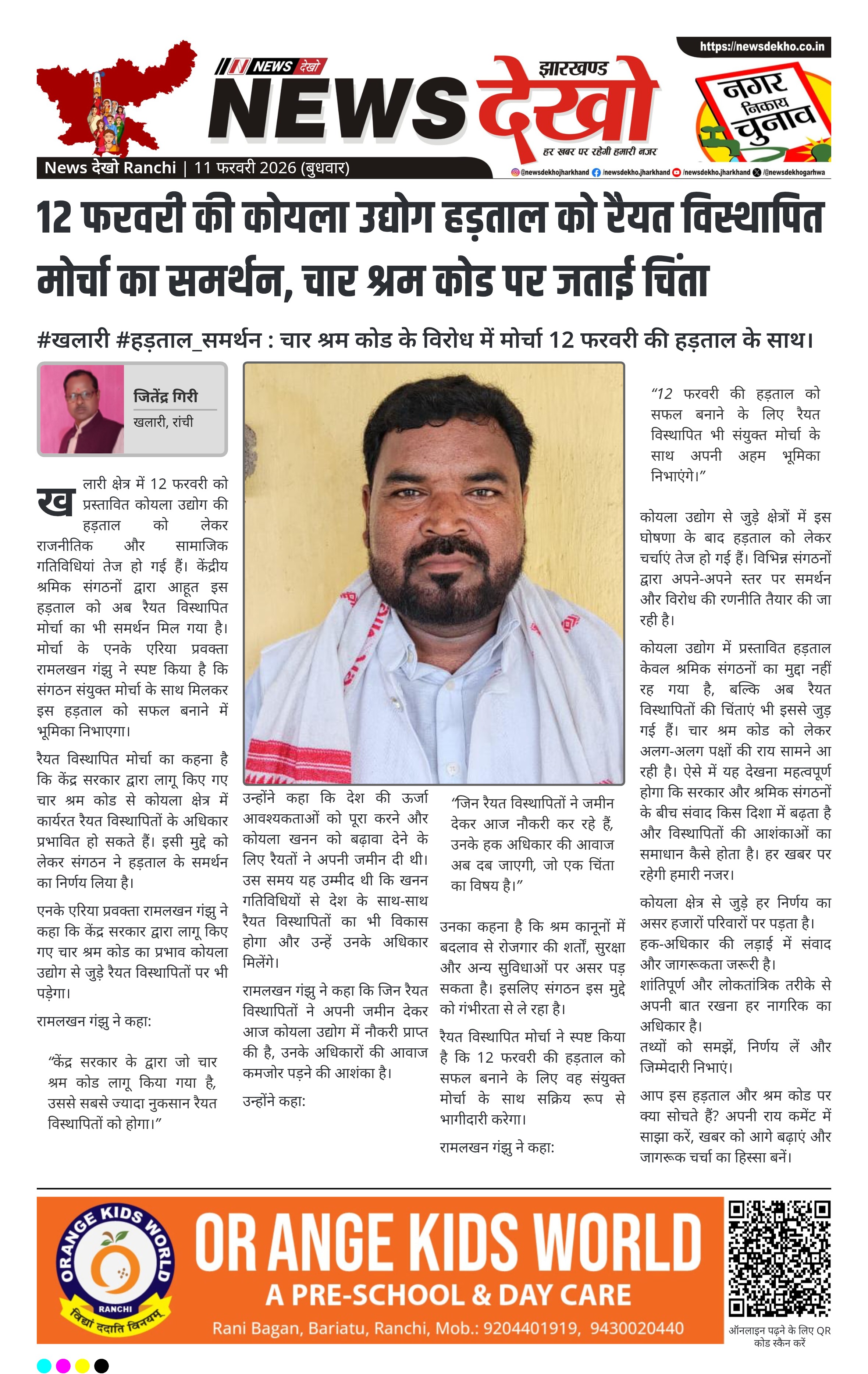 खलारी में रैयत विस्थापित मोर्चा ने 12 फरवरी को केंद्रीय श्रमिक संगठनों द्वारा आहूत कोयला उद्योग की हड़ताल का समर्थन करने की घोषणा की है। मोर्चा के एनके एरिया प्रवक्ता रामलखन गंझु ने चार श्रम कोड को रैयत विस्थापितों के अधिकारों के लिए नुकसानदेह बताया। उनका कहना है कि जमीन देने वाले विस्थापितों के हित प्रभावित हो सकते हैं। हड़ताल को संयुक्त मोर्चा के साथ सफल बनाने की बात कही गई है।