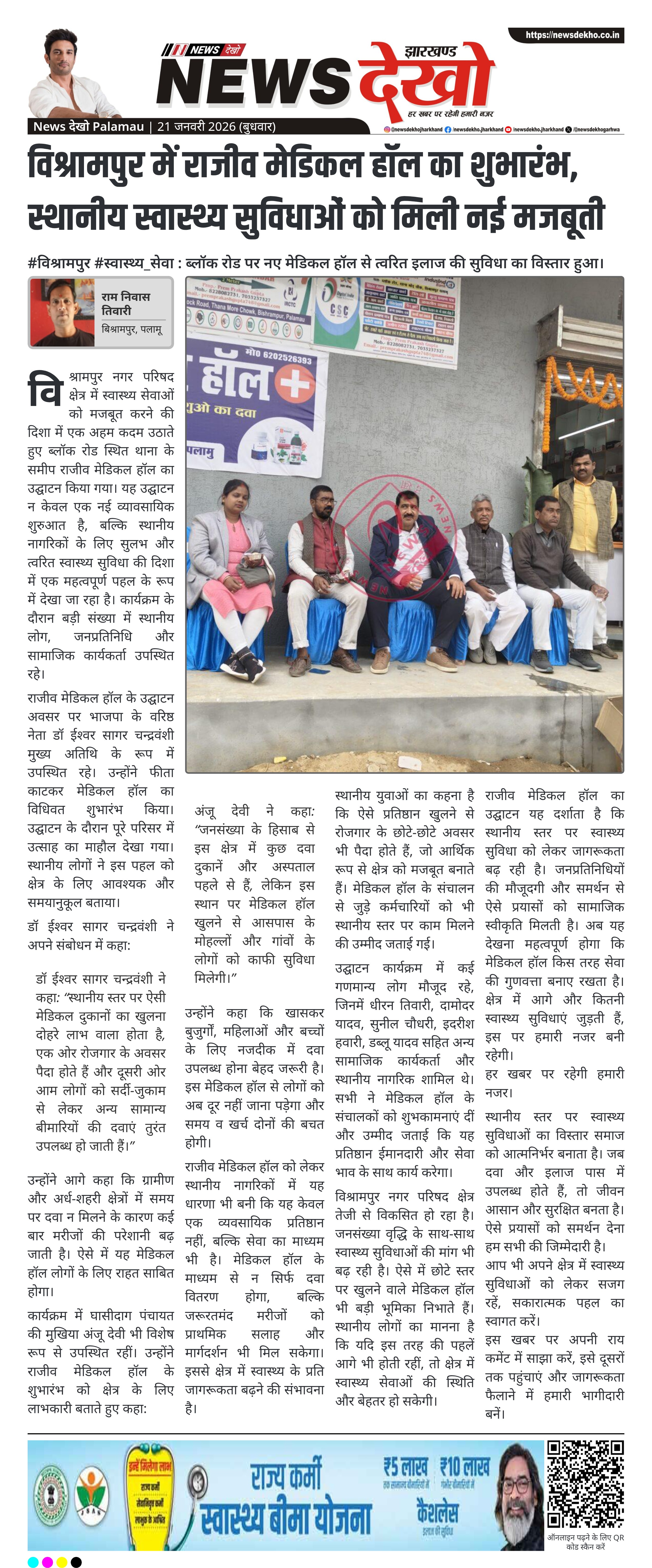 पलामू जिले के विश्रामपुर नगर परिषद क्षेत्र में स्वास्थ्य सुविधाओं को सुदृढ़ करने की दिशा में एक नई पहल के तहत राजीव मेडिकल हॉल का उद्घाटन किया गया। ब्लॉक रोड स्थित इस मेडिकल हॉल का उद्घाटन भाजपा के वरिष्ठ नेता डॉ ईश्वर सागर चन्द्रवंशी ने फीता काटकर किया। उद्घाटन कार्यक्रम में स्थानीय जनप्रतिनिधि और गणमान्य नागरिक उपस्थित रहे। क्षेत्रवासियों को इससे त्वरित दवा उपलब्धता और रोजगार के नए अवसर मिलने की उम्मीद जताई जा रही है।