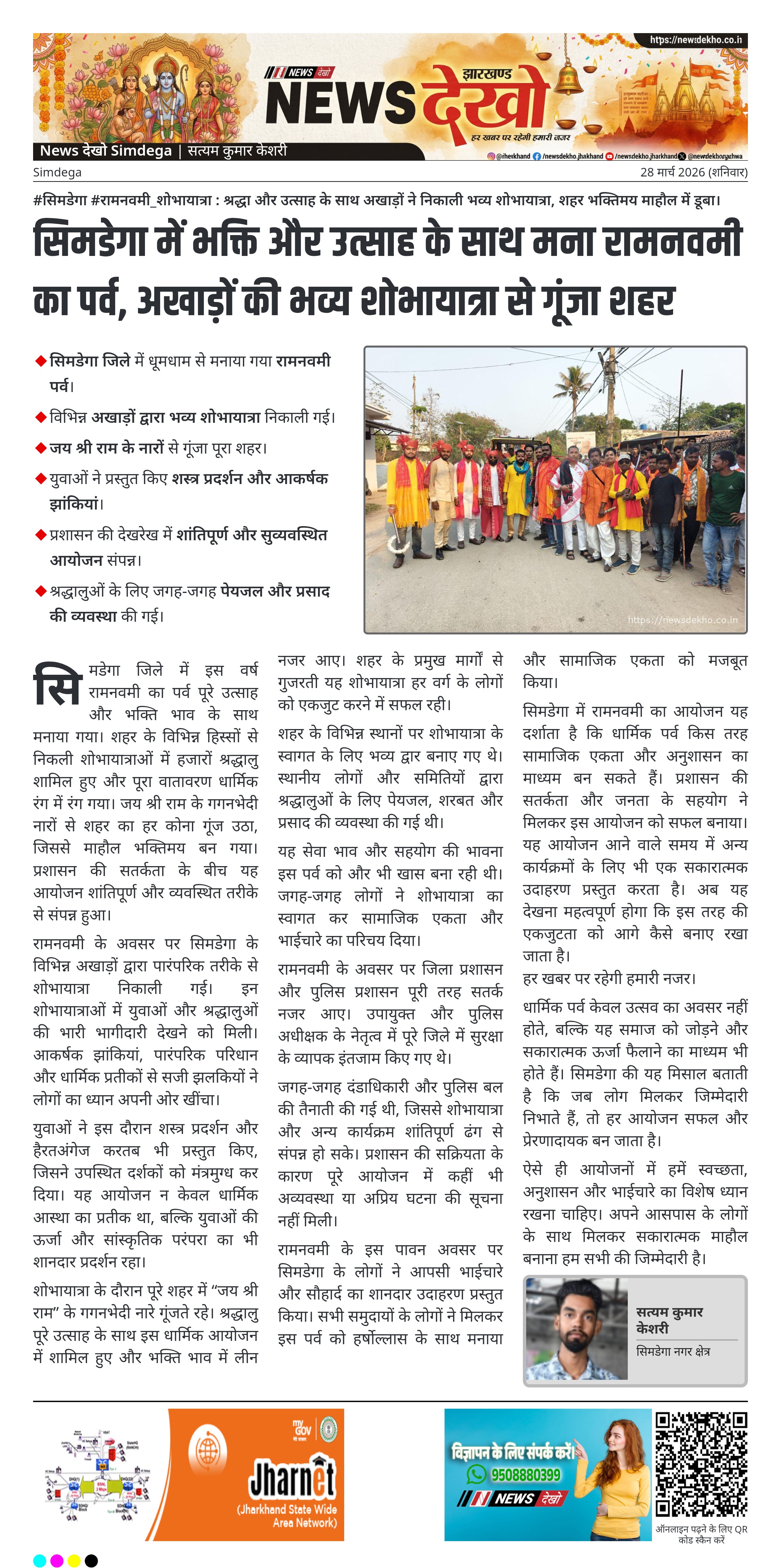 सिमडेगा जिले में इस वर्ष रामनवमी का पर्व पूरे उत्साह और भक्ति भाव के साथ मनाया गया। शहर के विभिन्न हिस्सों से निकली शोभायात्राओं में हजारों श्रद्धालु शामिल हुए और पूरा वातावरण धार्मिक रंग में रंग गया। जय श्री राम के गगनभेदी नारों से शहर का हर कोना गूंज उठा, जिससे माहौल भक्तिमय बन गया। प्रशासन की सतर्कता के बीच यह आयोजन शांतिपूर्ण और व्यवस्थित तरीके से संपन्न हुआ।