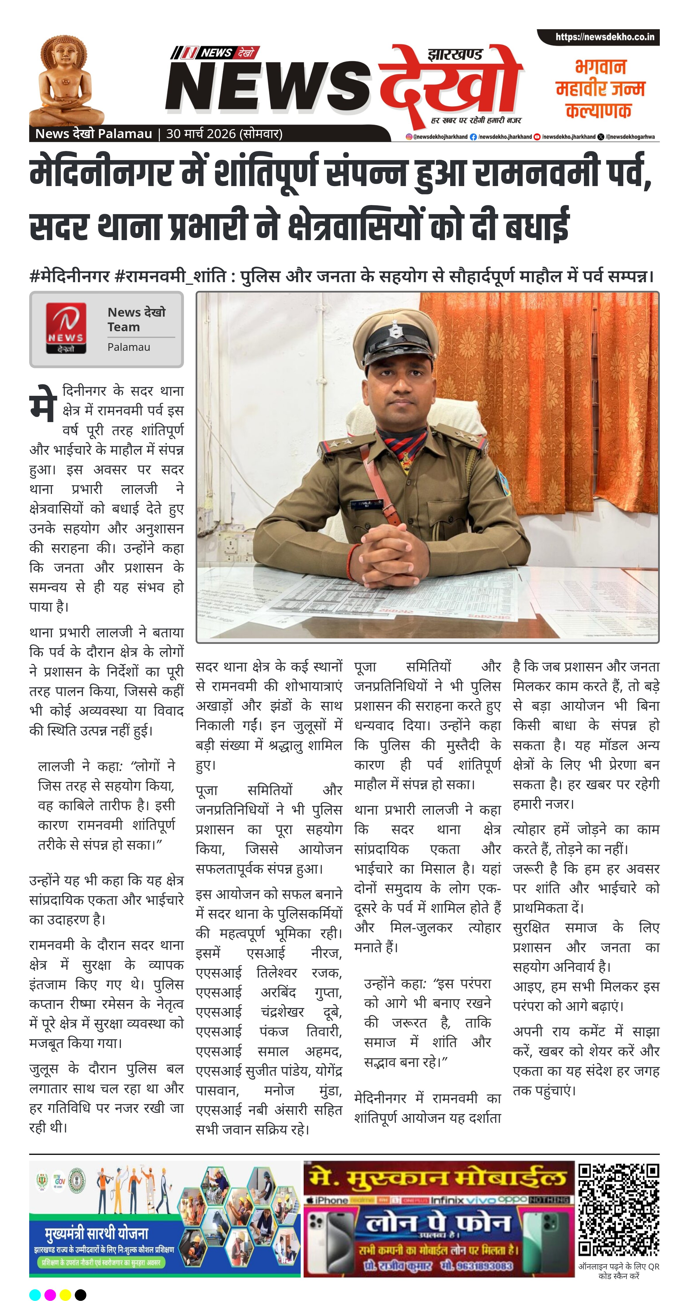 मेदिनीनगर के सदर थाना क्षेत्र में रामनवमी पर्व इस वर्ष पूरी तरह शांतिपूर्ण और भाईचारे के माहौल में संपन्न हुआ। इस अवसर पर सदर थाना प्रभारी लालजी ने क्षेत्रवासियों को बधाई देते हुए उनके सहयोग और अनुशासन की सराहना की। उन्होंने कहा कि जनता और प्रशासन के समन्वय से ही यह संभव हो पाया है।