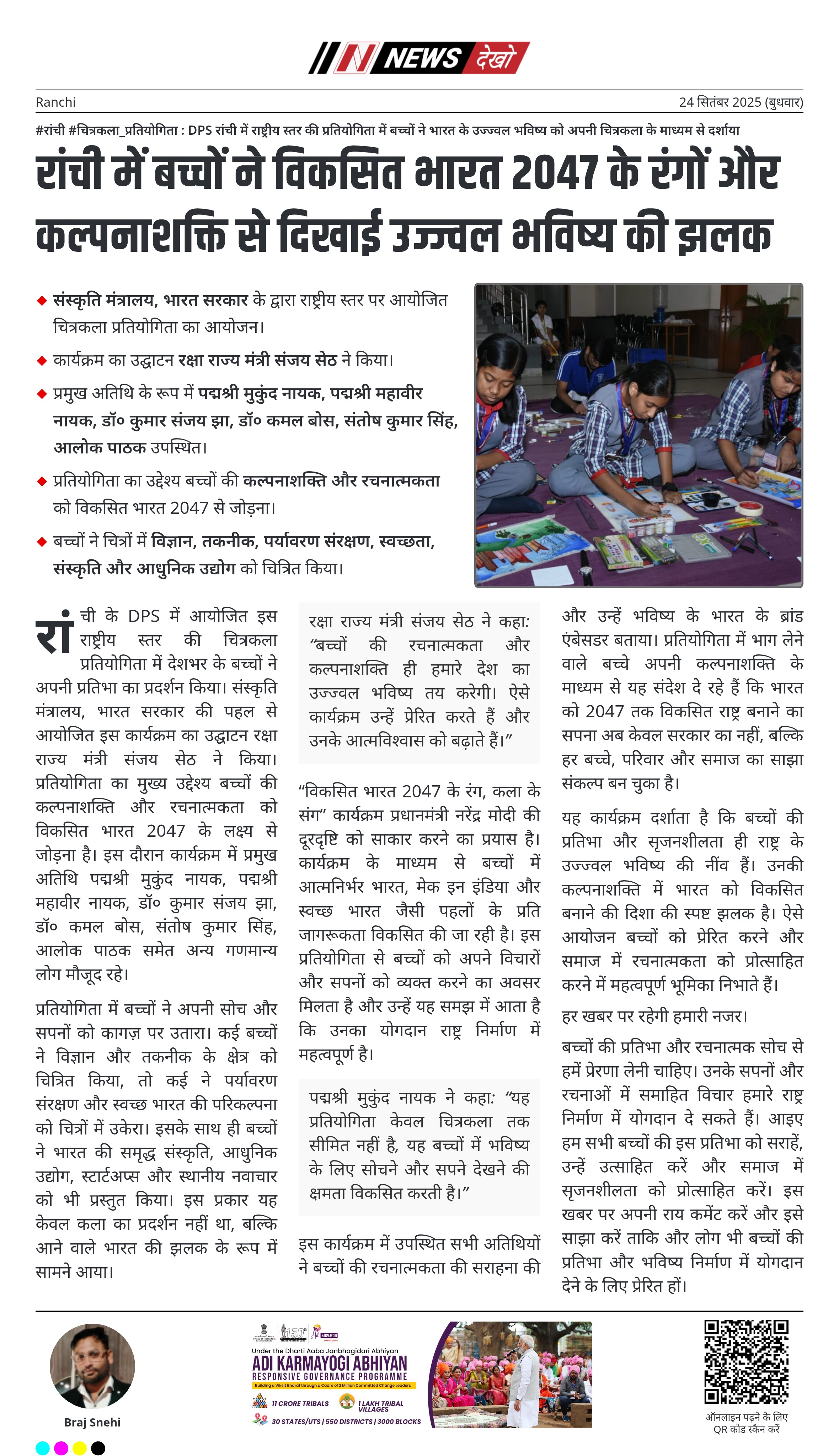 रांची के DPS में आयोजित इस राष्ट्रीय स्तर की चित्रकला प्रतियोगिता में देशभर के बच्चों ने अपनी प्रतिभा का प्रदर्शन किया। संस्कृति मंत्रालय, भारत सरकार की पहल से आयोजित इस कार्यक्रम का उद्घाटन रक्षा राज्य मंत्री संजय सेठ ने किया। प्रतियोगिता का मुख्य उद्देश्य बच्चों की कल्पनाशक्ति और रचनात्मकता को विकसित भारत 2047 के लक्ष्य से जोड़ना है। इस दौरान कार्यक्रम में प्रमुख अतिथि पद्मश्री मुकुंद नायक, पद्मश्री महावीर नायक, डॉ० कुमार संजय झा, डॉ० कमल बोस, संतोष कुमार सिंह, आलोक पाठक समेत अन्य गणमान्य लोग मौजूद रहे।