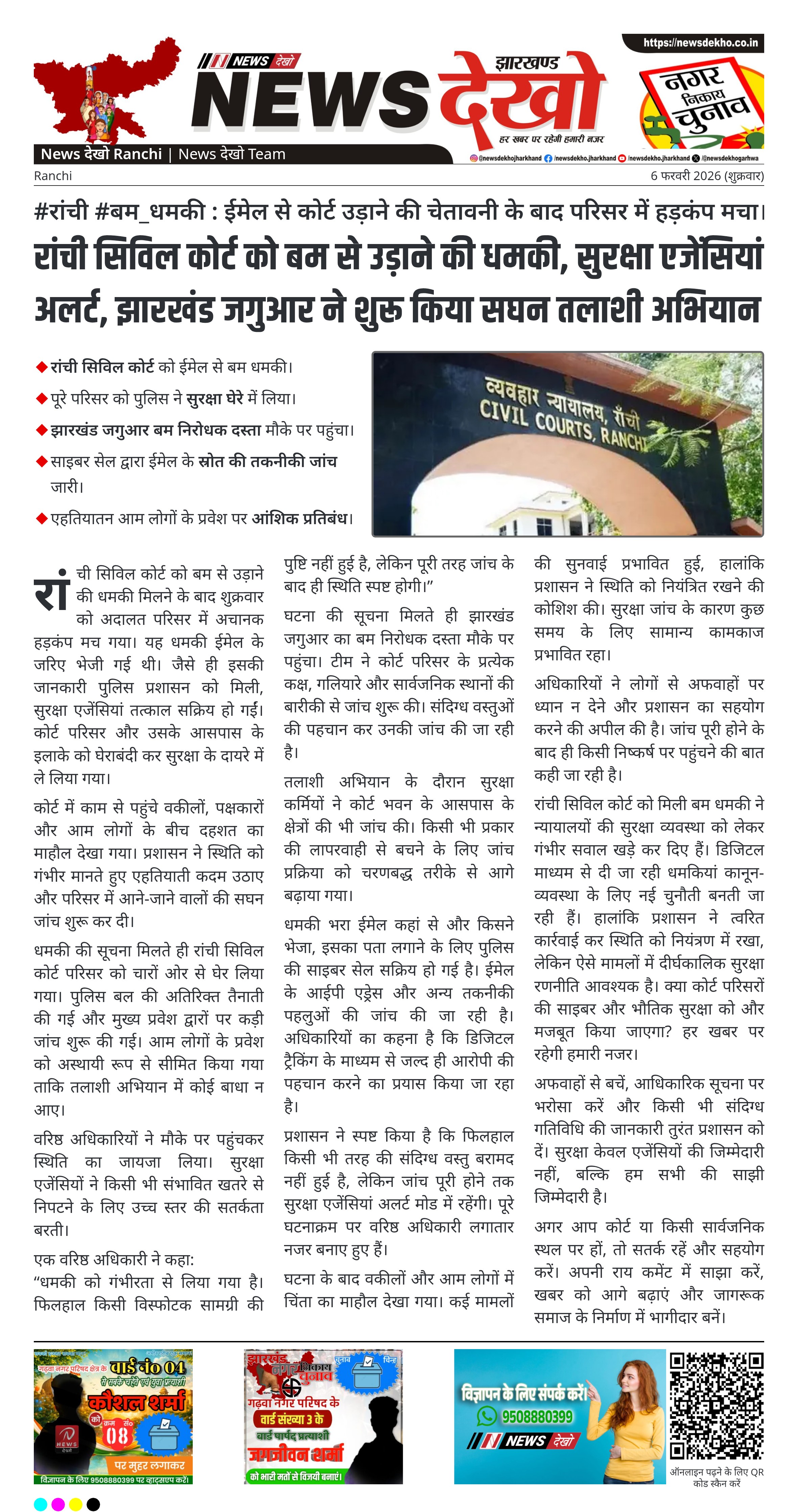 - रांची सिविल कोर्ट को ईमेल से बम धमकी।
