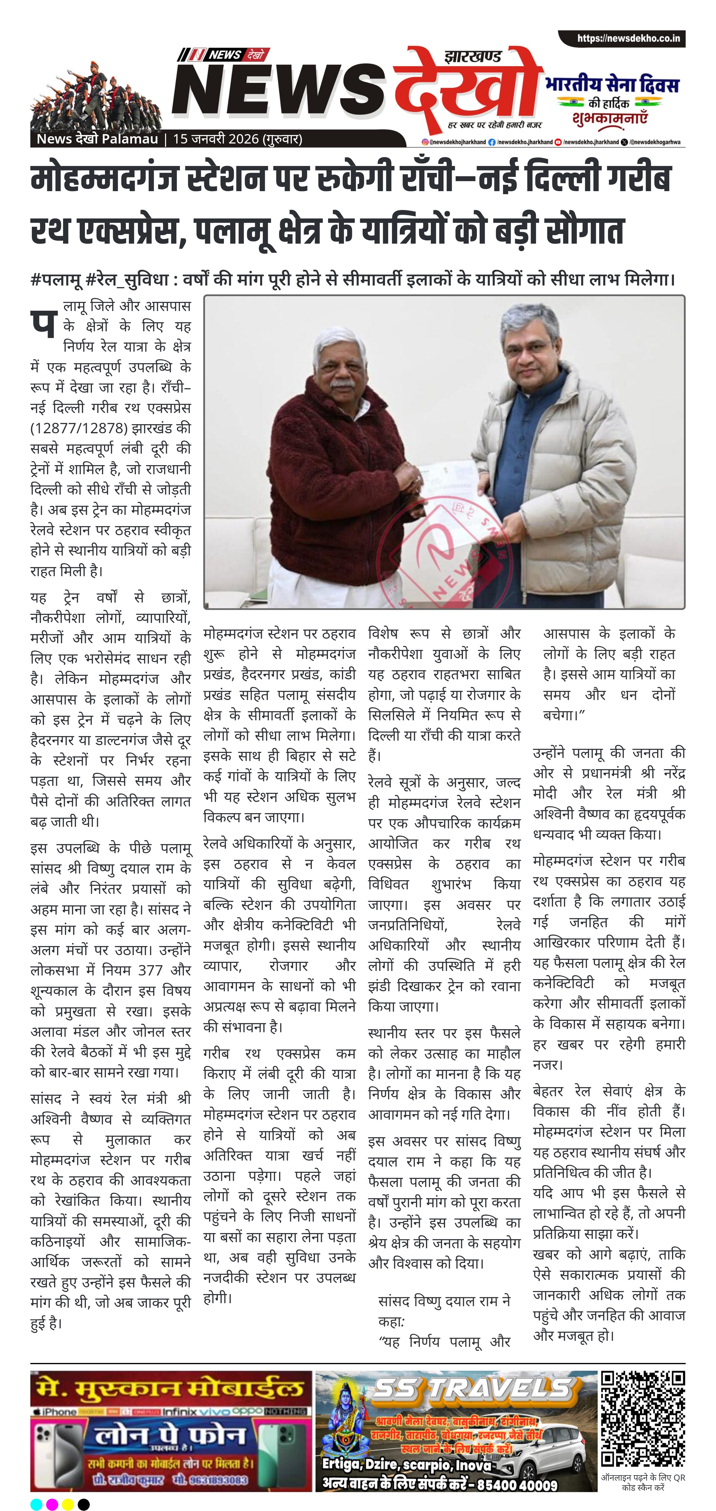 इस उपलब्धि के पीछे पलामू सांसद श्री विष्णु दयाल राम के लंबे और निरंतर प्रयासों को अहम माना जा रहा है। सांसद ने इस मांग को कई बार अलग-अलग मंचों पर उठाया। उन्होंने लोकसभा में नियम 377 और शून्यकाल के दौरान इस विषय को प्रमुखता से रखा। इसके अलावा मंडल और जोनल स्तर की रेलवे बैठकों में भी इस मुद्दे को बार-बार सामने रखा गया।