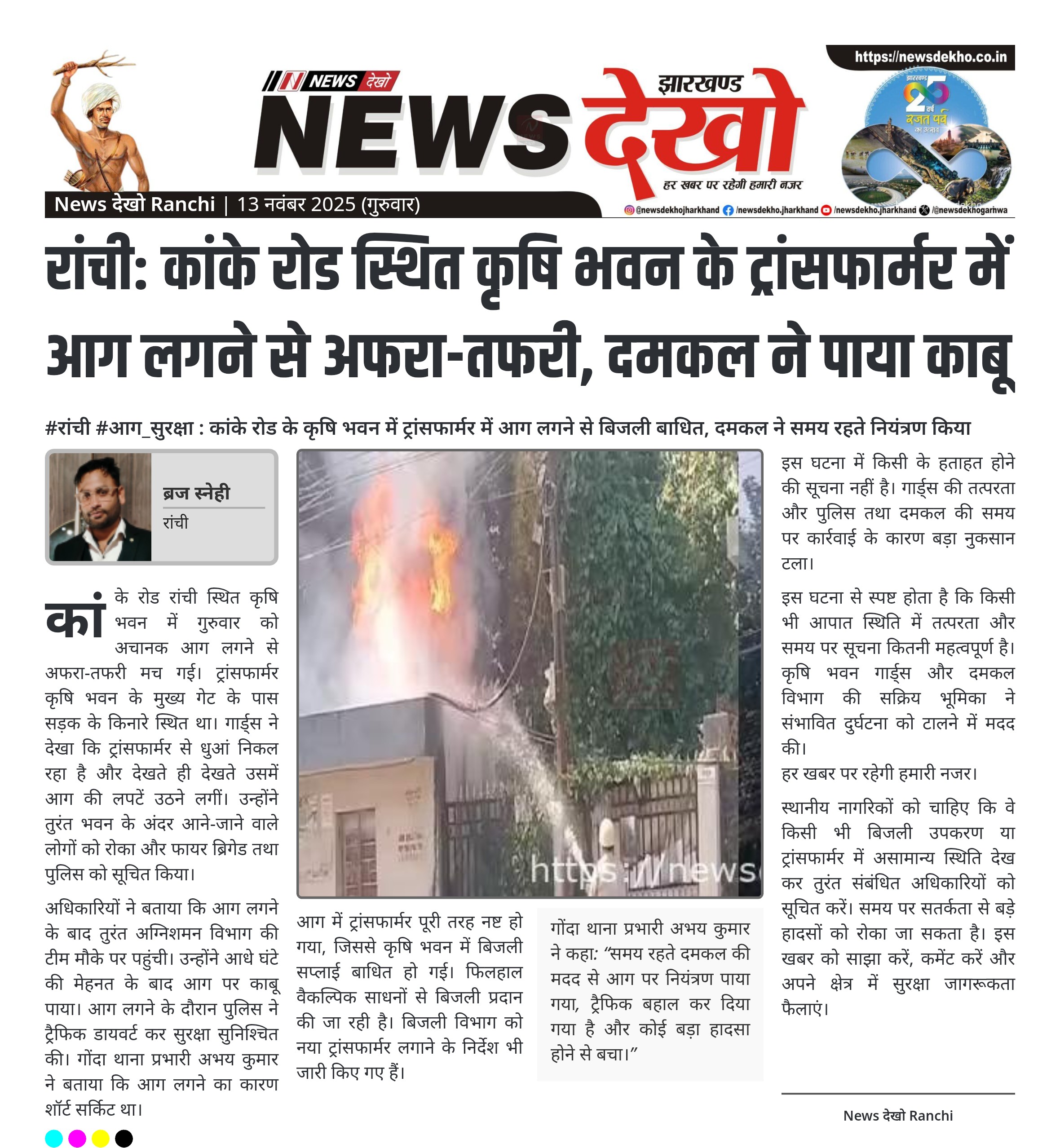 - कांके रोड, रांची स्थित कृषि भवन के ट्रांसफार्मर में गुरुवार को आग लगी।