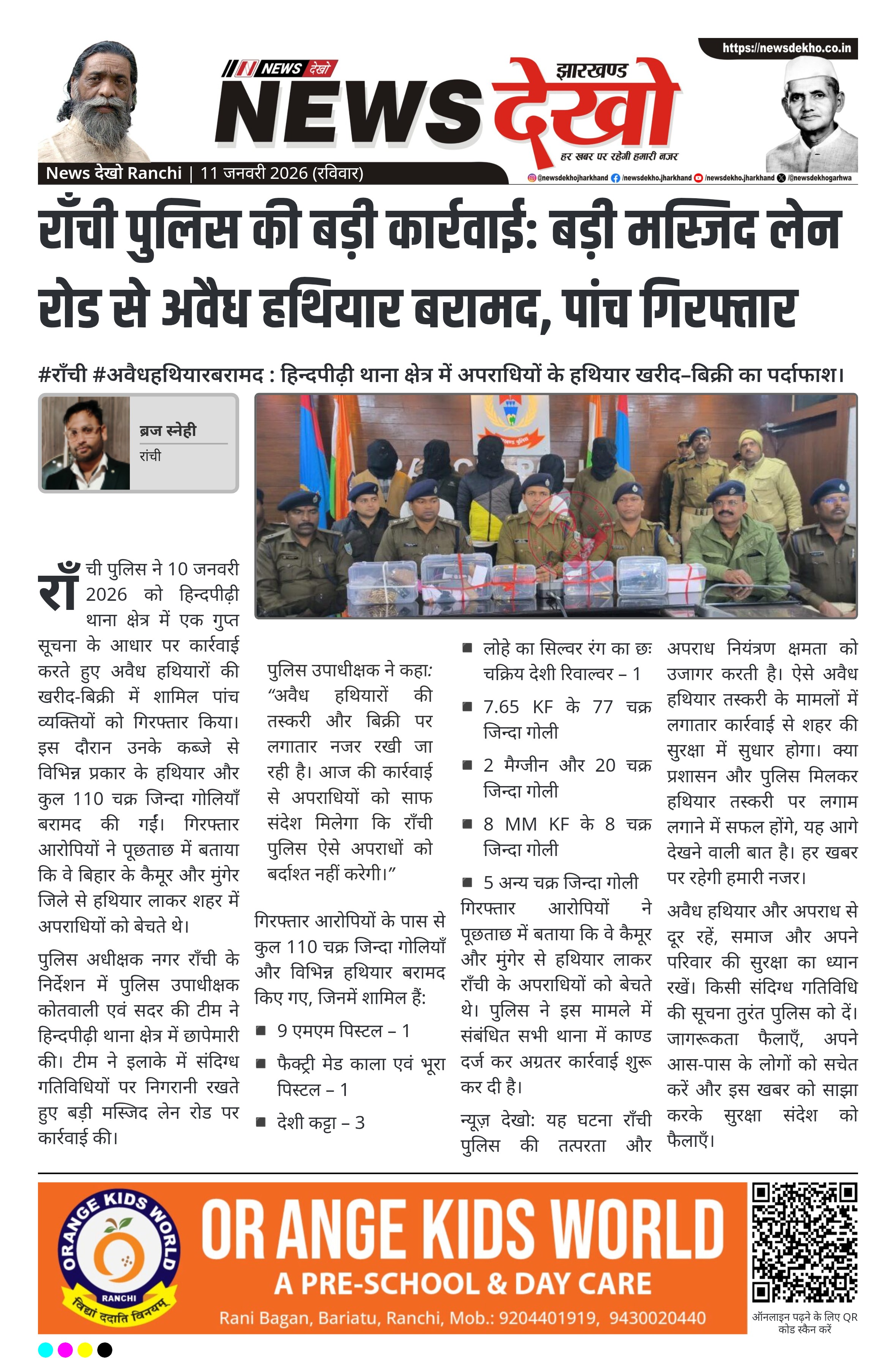 राँची पुलिस ने 10 जनवरी 2026 को हिन्दपीढ़ी थाना क्षेत्र में एक गुप्त सूचना के आधार पर कार्रवाई करते हुए अवैध हथियारों की खरीद-बिक्री में शामिल पांच व्यक्तियों को गिरफ्तार किया। इस दौरान उनके कब्जे से विभिन्न प्रकार के हथियार और कुल 110 चक्र जिन्दा गोलियाँ बरामद की गईं। गिरफ्तार आरोपियों ने पूछताछ में बताया कि वे बिहार के कैमूर और मुंगेर जिले से हथियार लाकर शहर में अपराधियों को बेचते थे।
