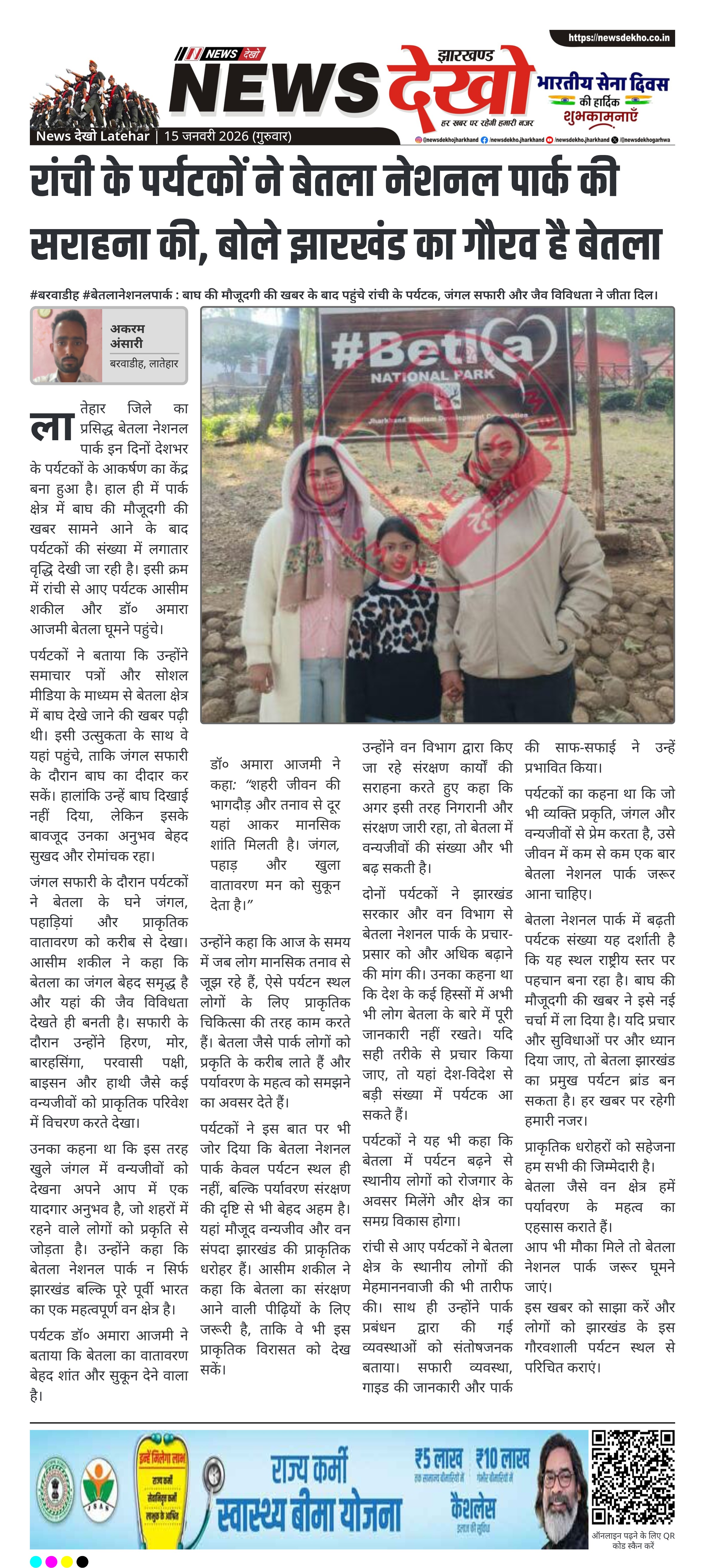 लातेहार जिले का प्रसिद्ध बेतला नेशनल पार्क इन दिनों देशभर के पर्यटकों के आकर्षण का केंद्र बना हुआ है। हाल ही में पार्क क्षेत्र में बाघ की मौजूदगी की खबर सामने आने के बाद पर्यटकों की संख्या में लगातार वृद्धि देखी जा रही है। इसी क्रम में रांची से आए पर्यटक आसीम शकील और डॉ० अमारा आजमी बेतला घूमने पहुंचे।