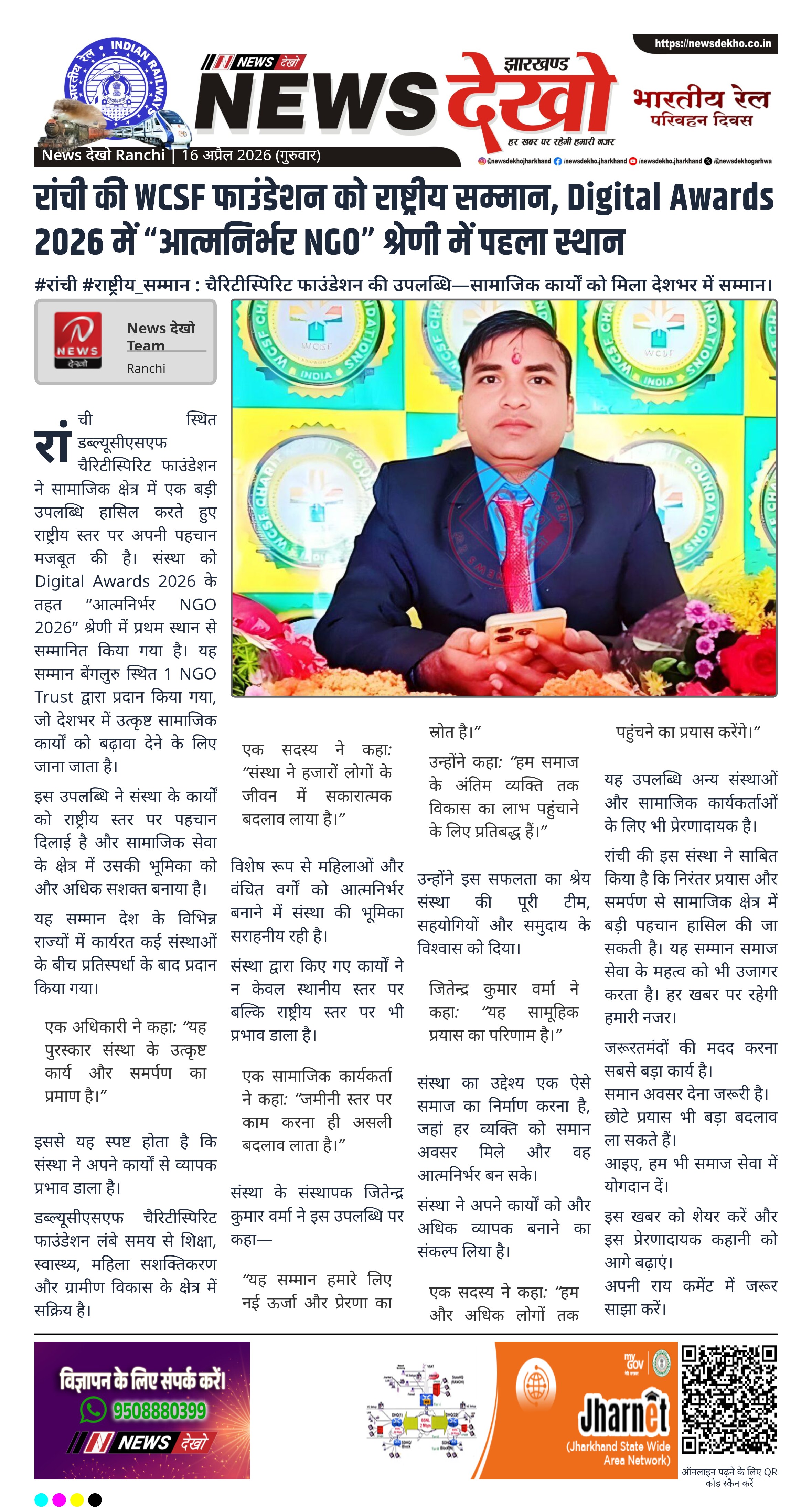 रांची स्थित डब्ल्यूसीएसएफ चैरिटीस्पिरिट फाउंडेशन ने सामाजिक क्षेत्र में एक बड़ी उपलब्धि हासिल करते हुए राष्ट्रीय स्तर पर अपनी पहचान मजबूत की है। संस्था को Digital Awards 2026 के तहत “आत्मनिर्भर NGO 2026” श्रेणी में प्रथम स्थान से सम्मानित किया गया है। यह सम्मान बेंगलुरु स्थित 1 NGO Trust द्वारा प्रदान किया गया, जो देशभर में उत्कृष्ट सामाजिक कार्यों को बढ़ावा देने के लिए जाना जाता है।