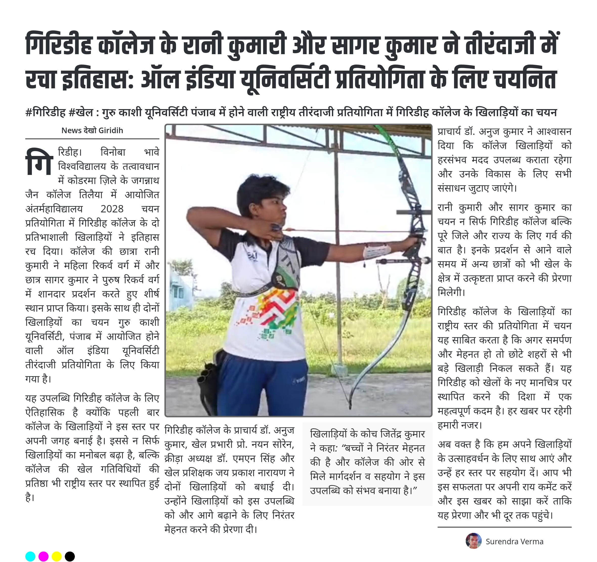 #गिरिडीह #खेल : गुरु काशी यूनिवर्सिटी पंजाब में होने वाली राष्ट्रीय तीरंदाजी प्रतियोगिता में गिरिडीह कॉलेज के खिलाड़ियों का चयन