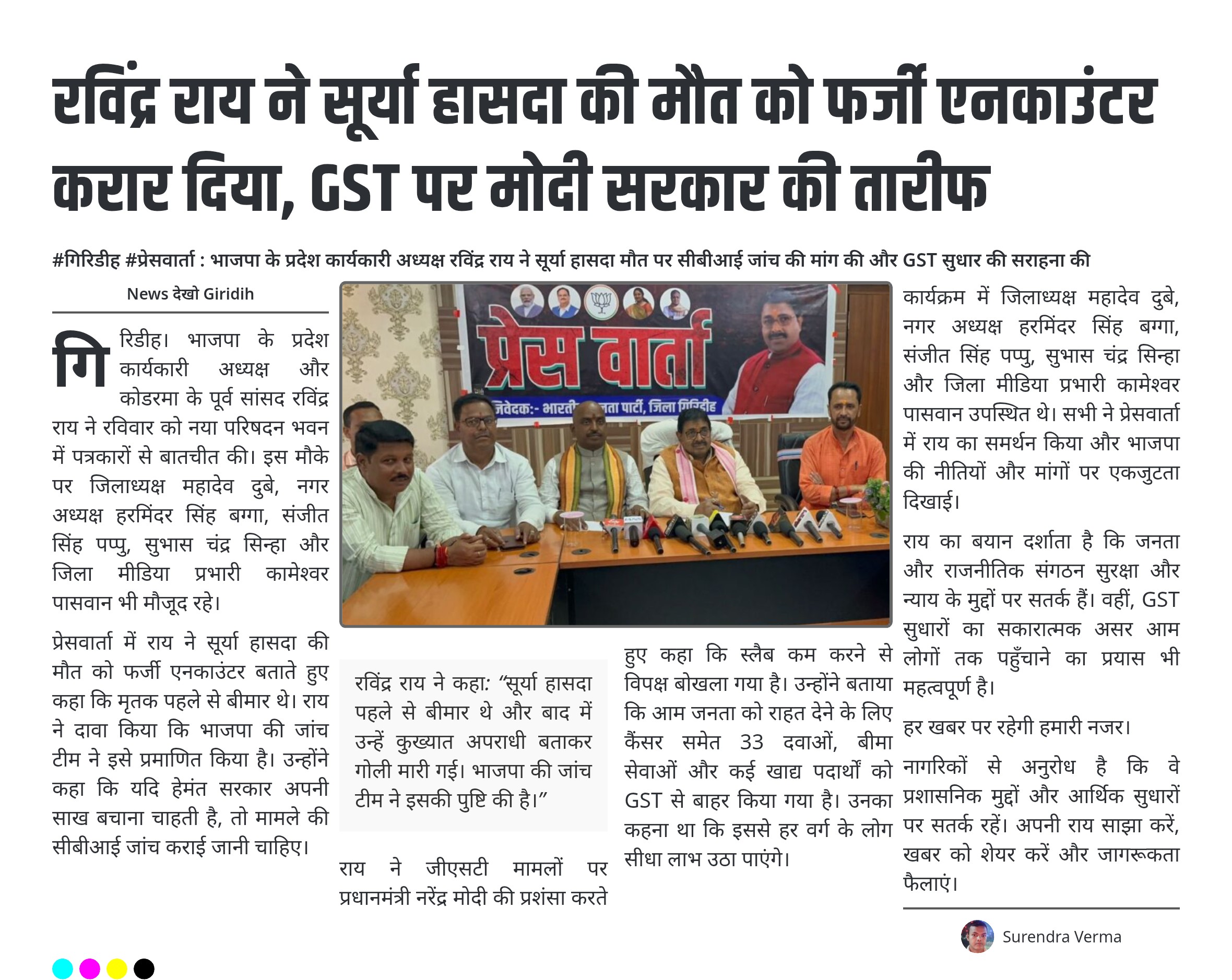 #गिरिडीह #प्रेसवार्ता : भाजपा के प्रदेश कार्यकारी अध्यक्ष रविंद्र राय ने सूर्या हासदा मौत पर सीबीआई जांच की मांग की और GST सुधार की सराहना की