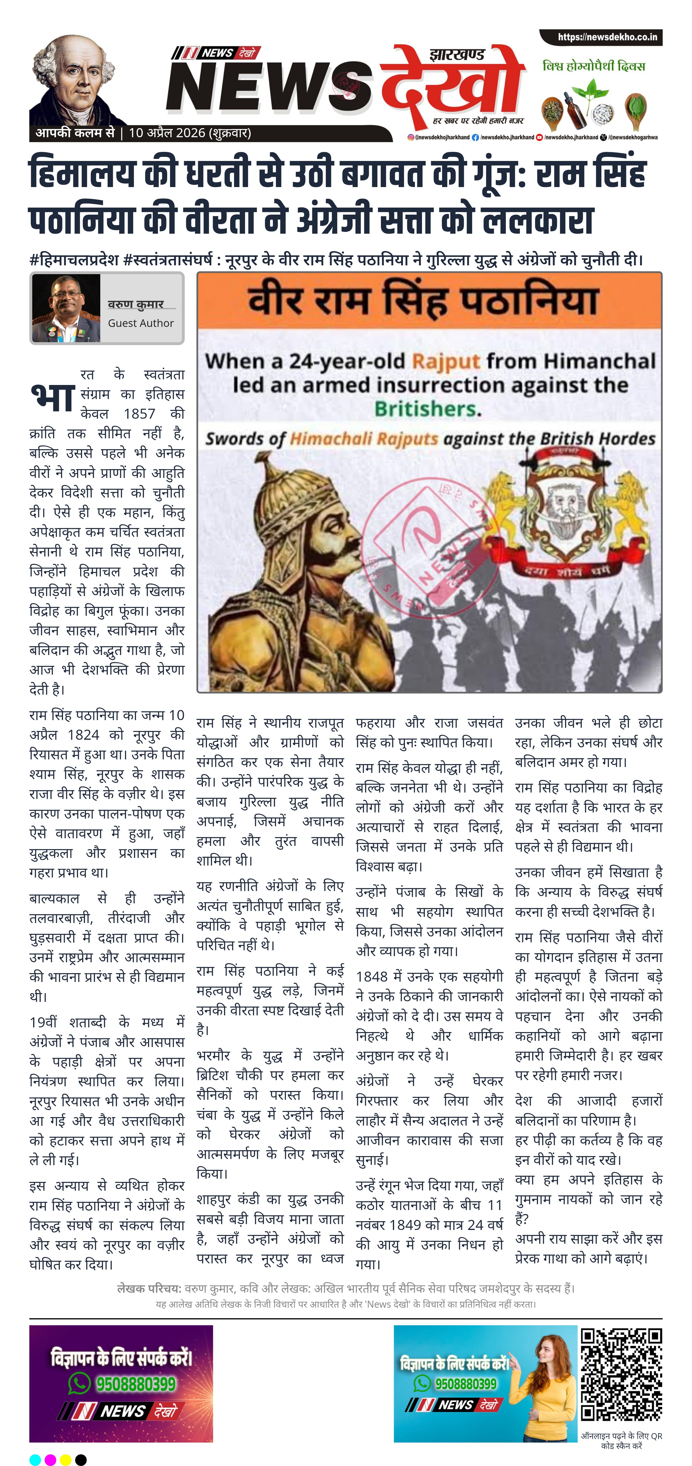 राम सिंह पठानिया जैसे वीरों का योगदान इतिहास में उतना ही महत्वपूर्ण है जितना बड़े आंदोलनों का। ऐसे नायकों को पहचान देना और उनकी कहानियों को आगे बढ़ाना हमारी जिम्मेदारी है। हर खबर पर रहेगी हमारी नजर।