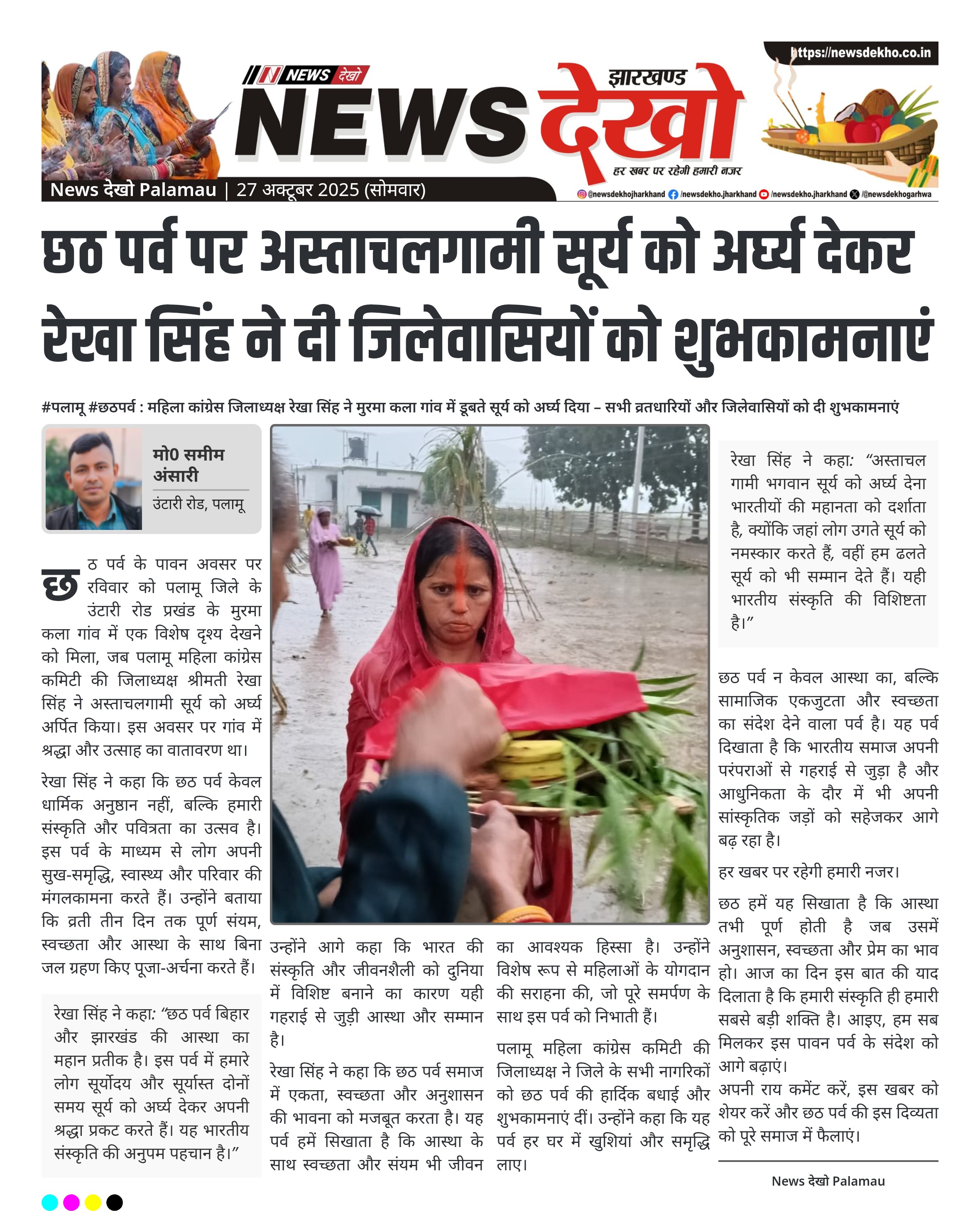पलामू महिला कांग्रेस कमिटी की जिलाध्यक्ष ने जिले के सभी नागरिकों को छठ पर्व की हार्दिक बधाई और शुभकामनाएं दीं। उन्होंने कहा कि यह पर्व हर घर में खुशियां और समृद्धि लाए।