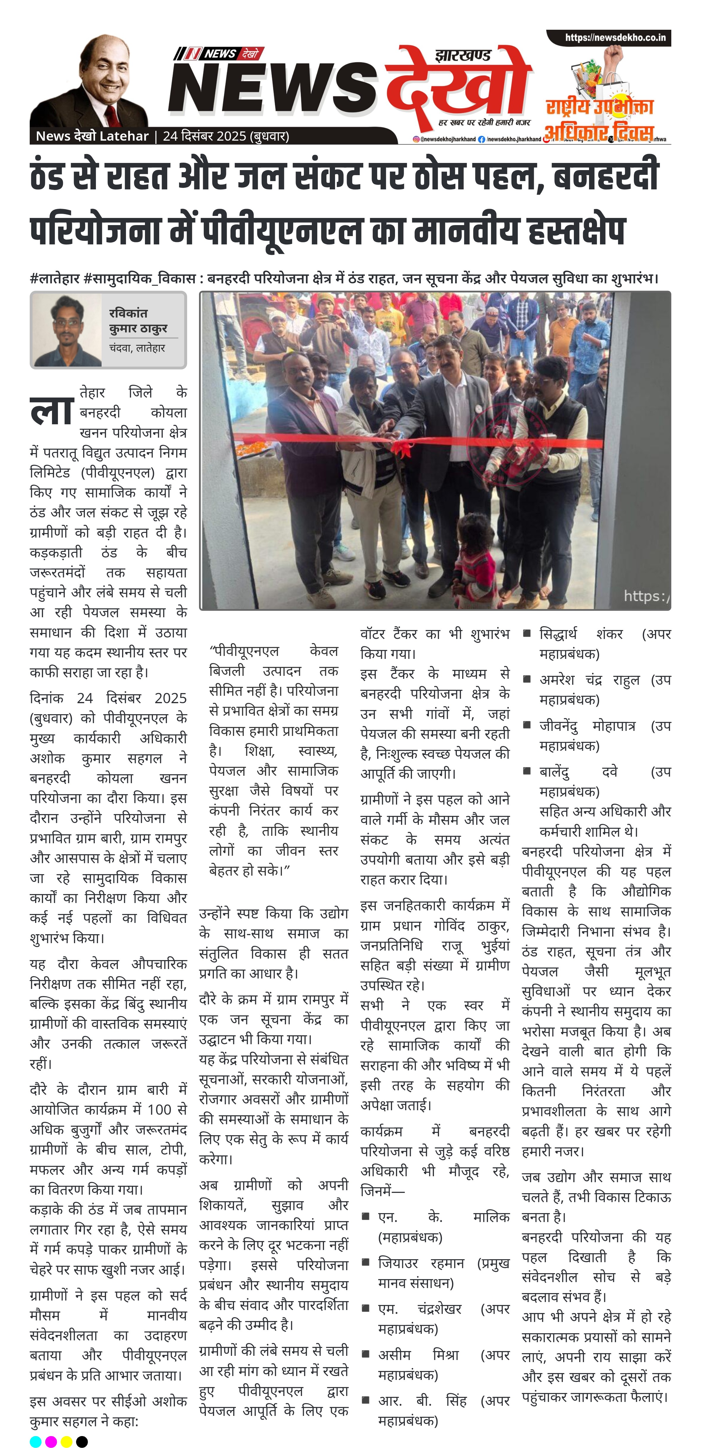 लातेहार जिले के बनहरदी कोयला खनन परियोजना क्षेत्र में पतरातू विद्युत उत्पादन निगम लिमिटेड द्वारा सामाजिक दायित्व के तहत जनहितकारी पहल की गई। 24 दिसंबर 2025 को पीवीयूएनएल के सीईओ अशोक कुमार सहगल ने परियोजना प्रभावित गांवों में ठंड राहत, जन सूचना केंद्र और पेयजल आपूर्ति की शुरुआत की। इस पहल का उद्देश्य ठंड और जल संकट से जूझ रहे ग्रामीणों को तत्काल राहत देना है। परियोजना क्षेत्र में इसे उद्योग और समाज के बीच सकारात्मक संबंध की दिशा में अहम कदम माना जा रहा है।
